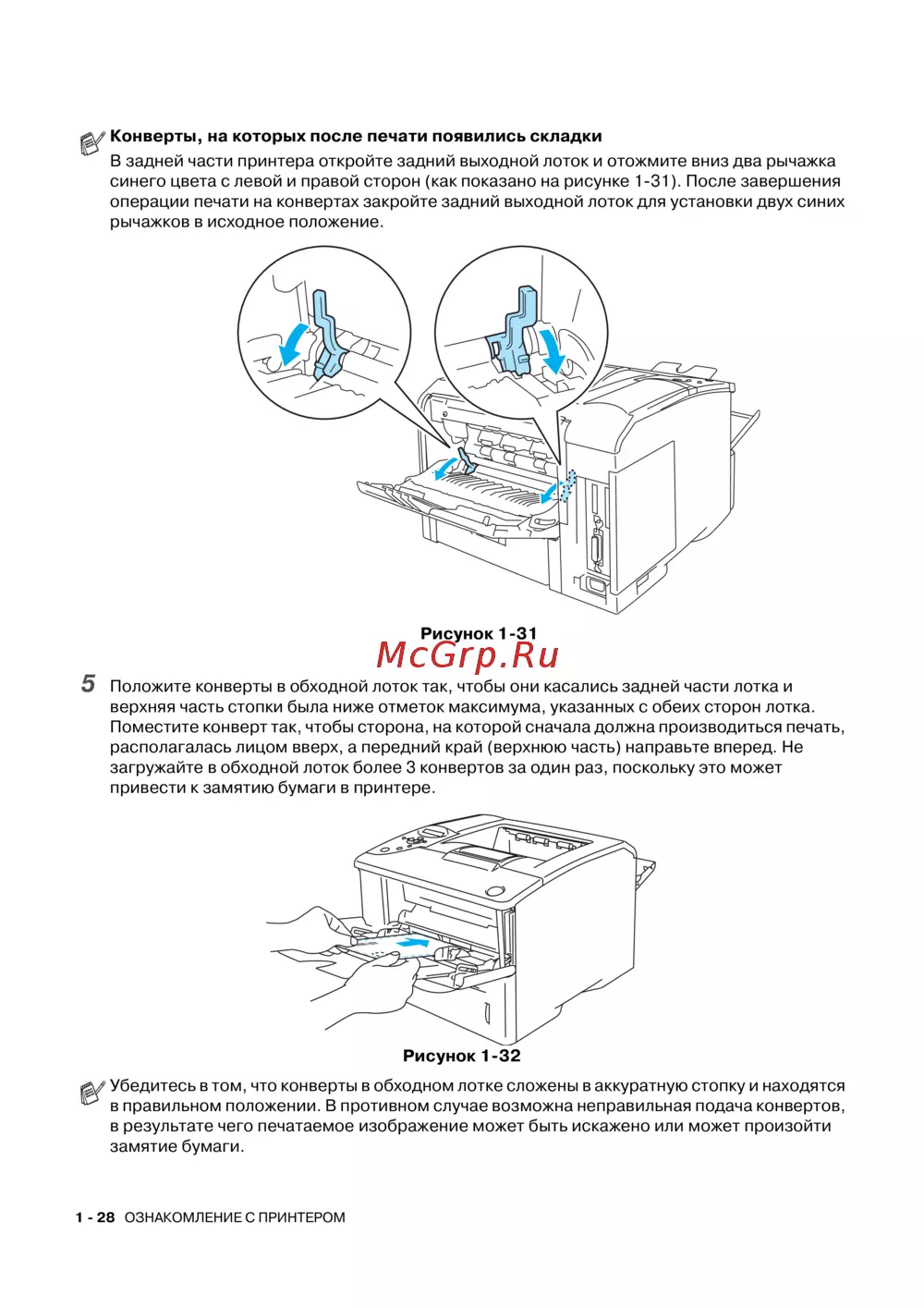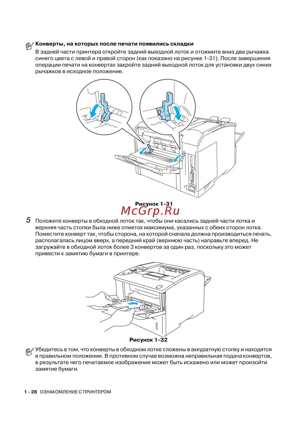 операции печати на конвертах закройте задний выходной лоток для установки двух синих