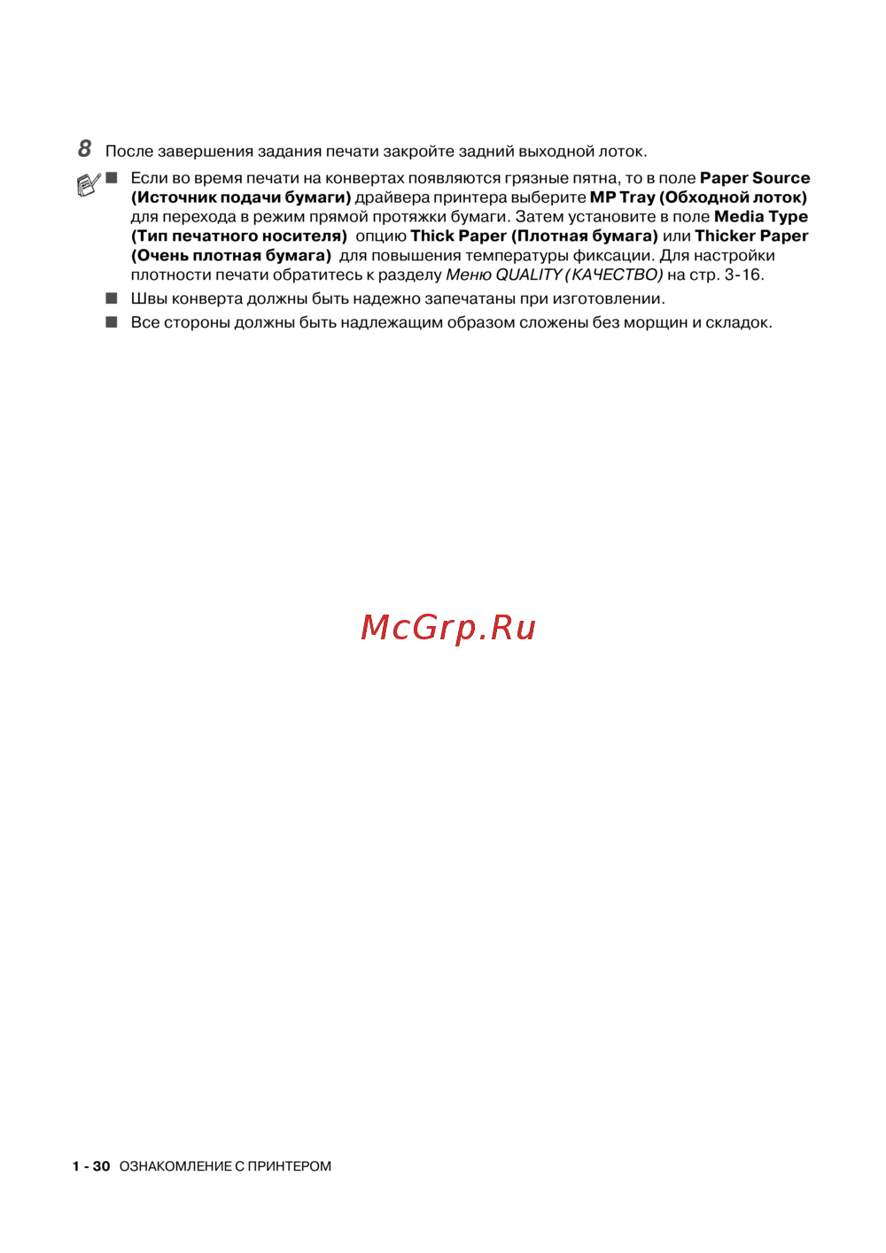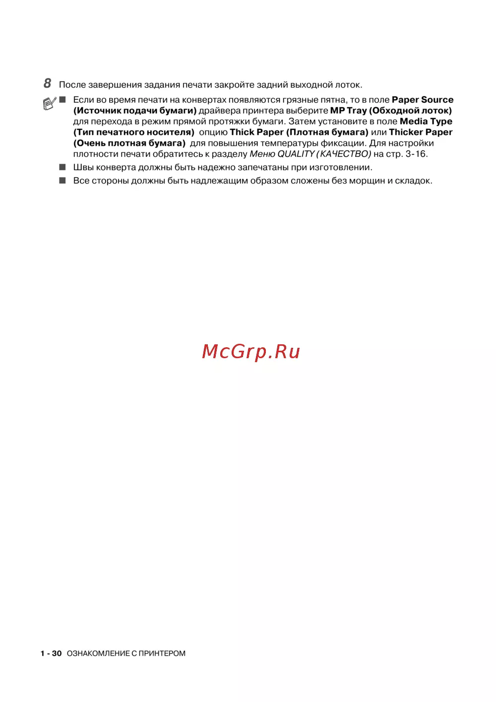 ■ Если во время печати на конвертах появляются грязные пятна, то в поле Paper Source
