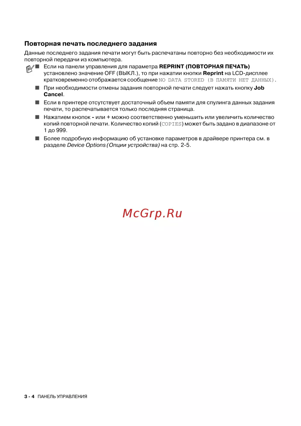 Данные последнего задания печати могут быть распечатаны повторно без необходимости их