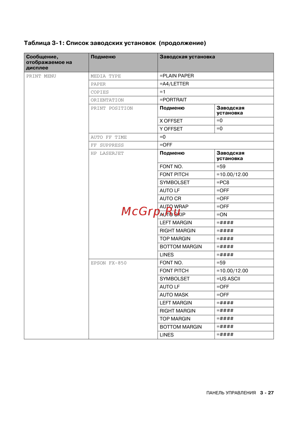 HP LASERJET Подменю Заводская