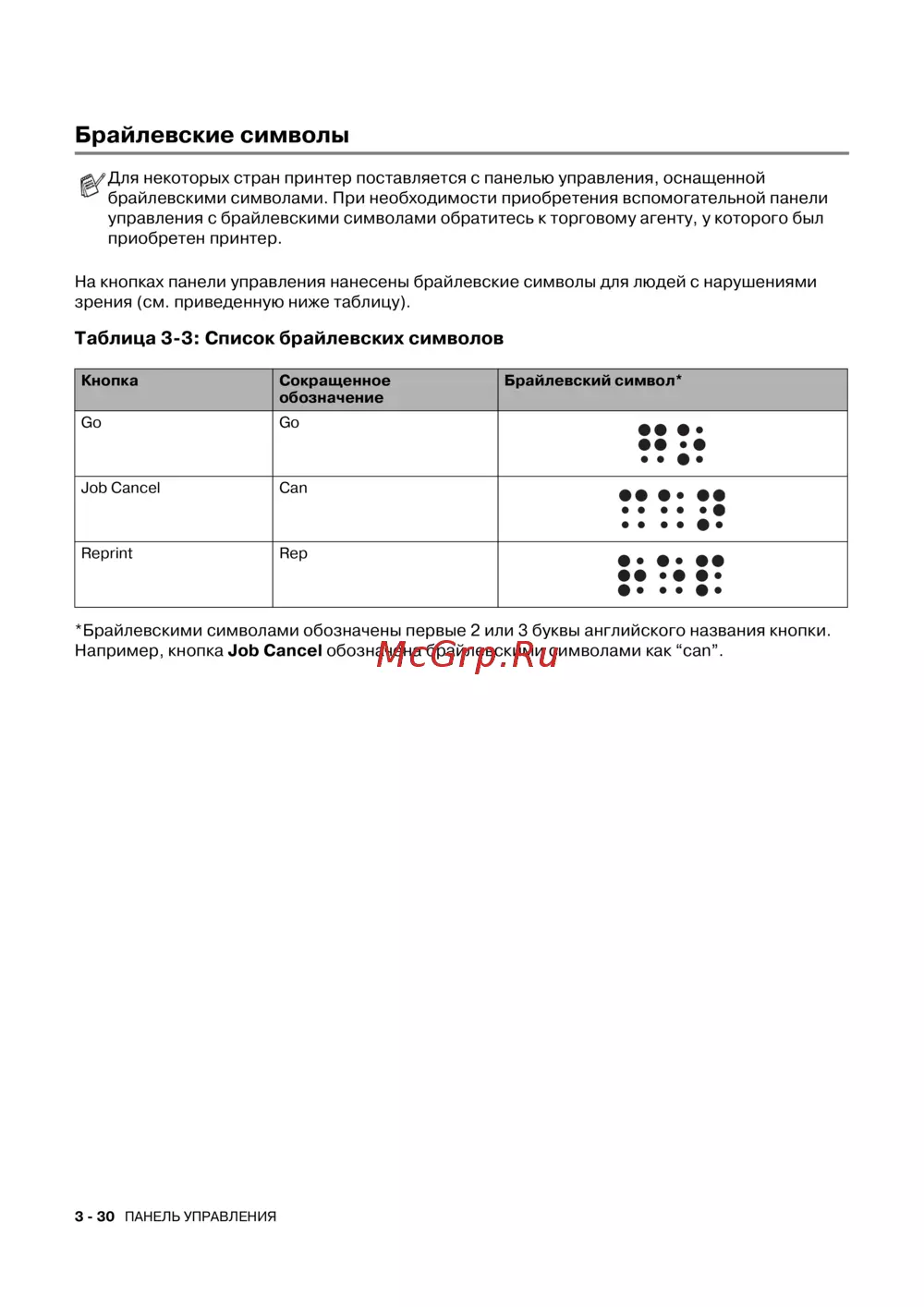 Например, кнопка Job Cancel обозначена брайлевскими символами как “can”.