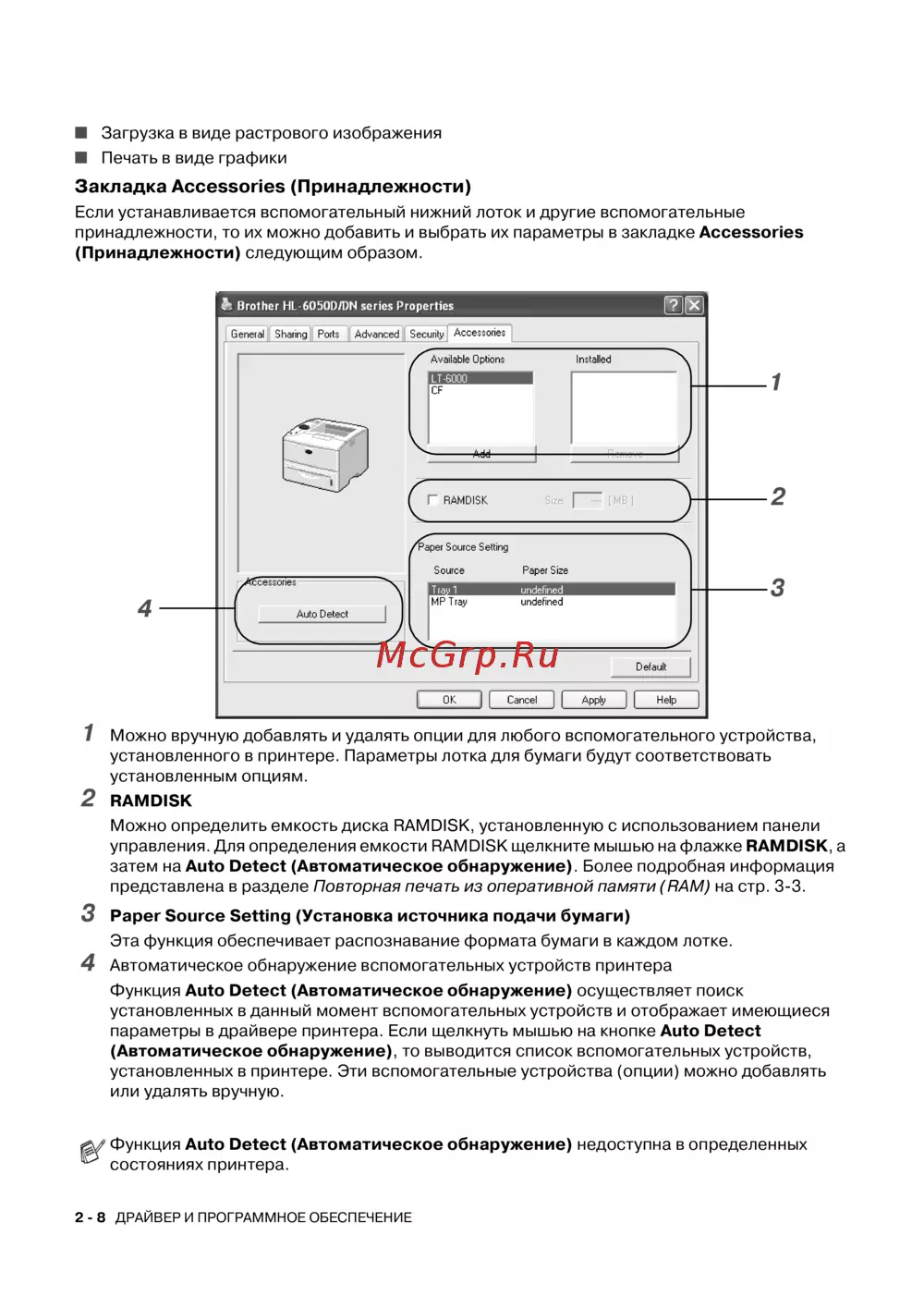 параметры в драйвере принтера. Если щелкнуть мышью на кнопке Auto Detect