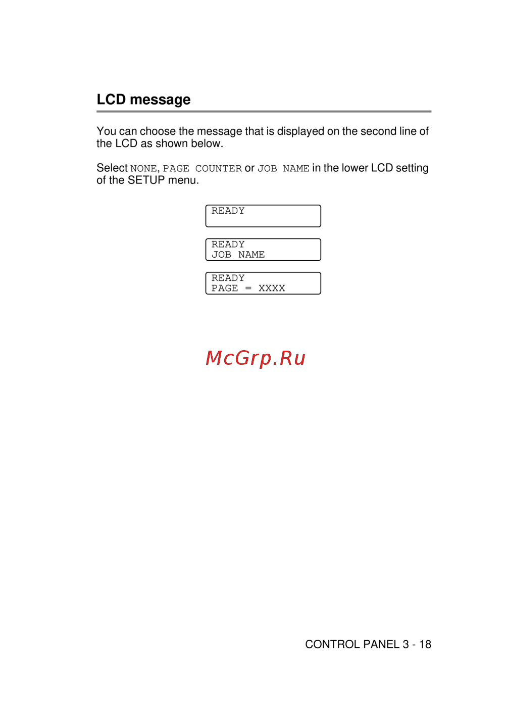 Select NONE, PAGE COUNTER or JOB NAME in the lower LCD setting