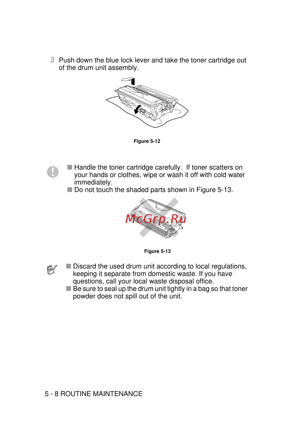 Узнайте, как правильно извлекать и утилизировать картриджи и блоки барабана. Следуйте инструкциям для безопасного обращения с тонером и соблюдения местных норм утилизации.