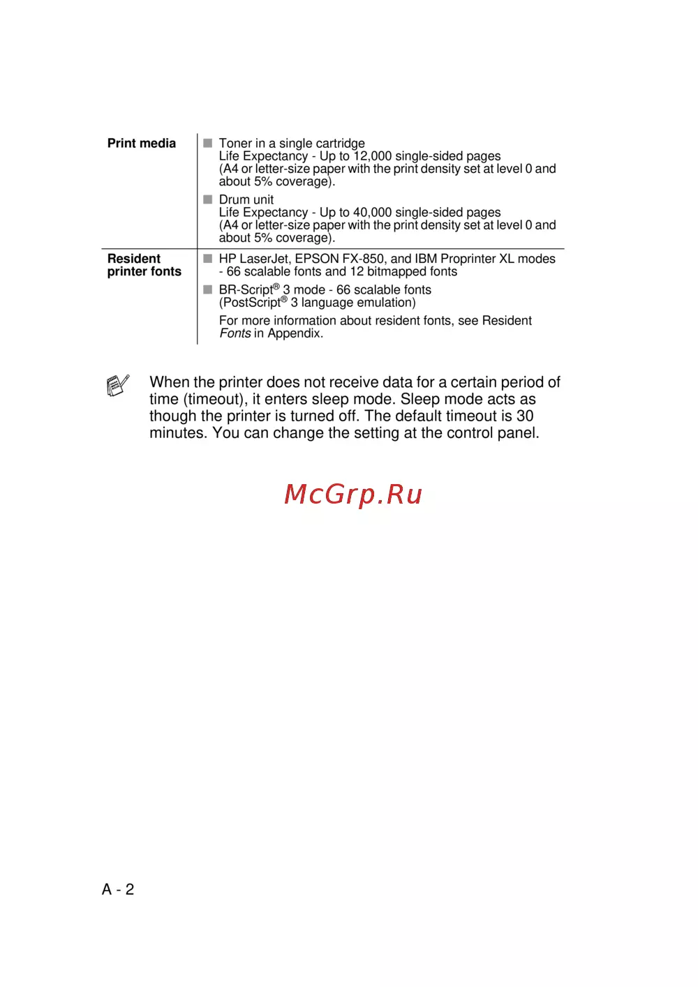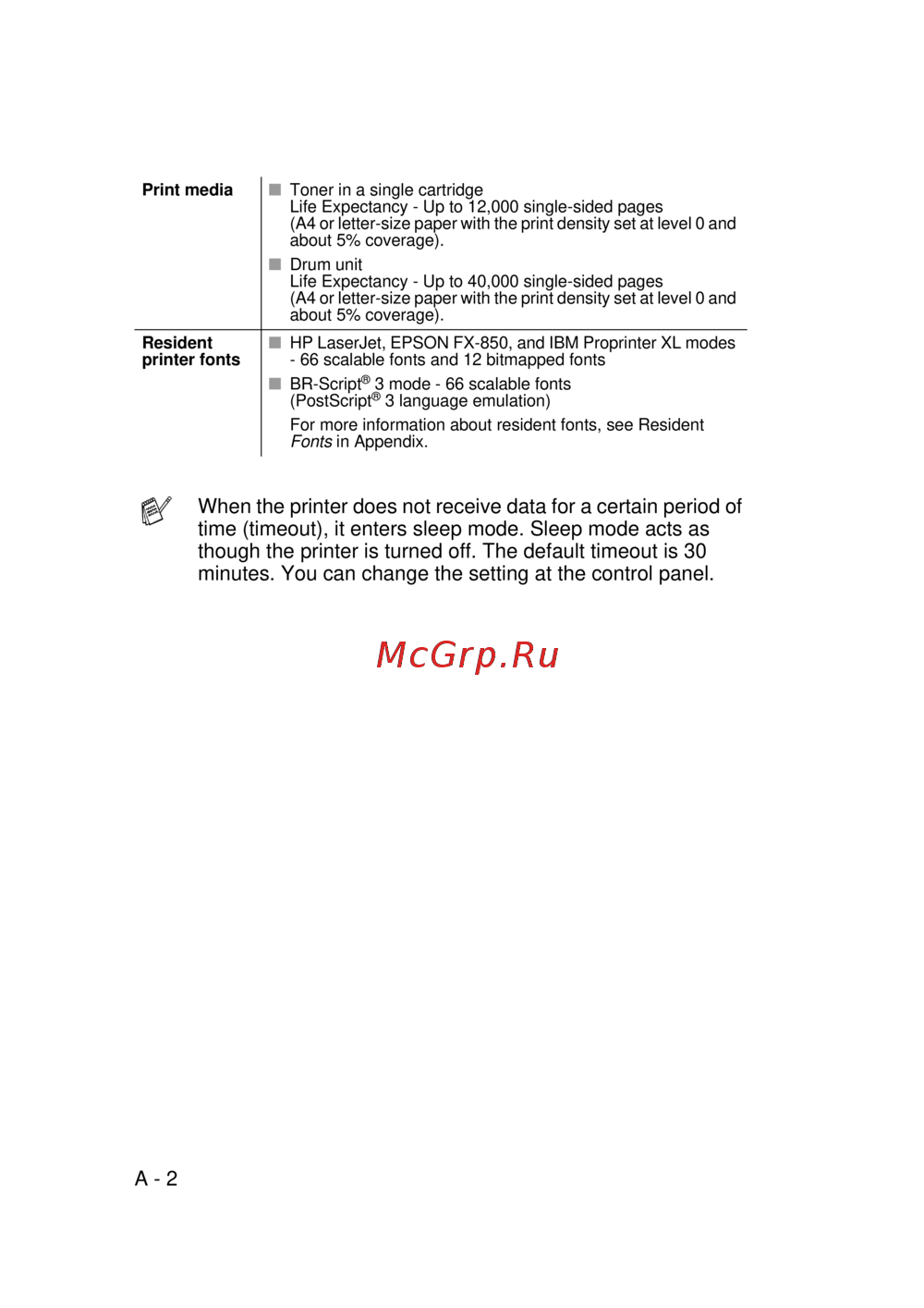 ![Brother HL-7050 [201/253] When the printer does not receive data for a certain period of time timeout it enters sleep mode sleep mode acts as though the printer is turned off the default timeout is 30 minutes you can change the setting at the control panel](/views2/1025192/page201/bgc9.png)