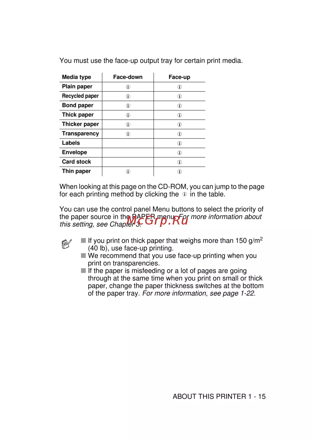 - When you print on thick paper labels and card stock we recommend that you select the media type setting in the printer driver according to the paper weight p.205