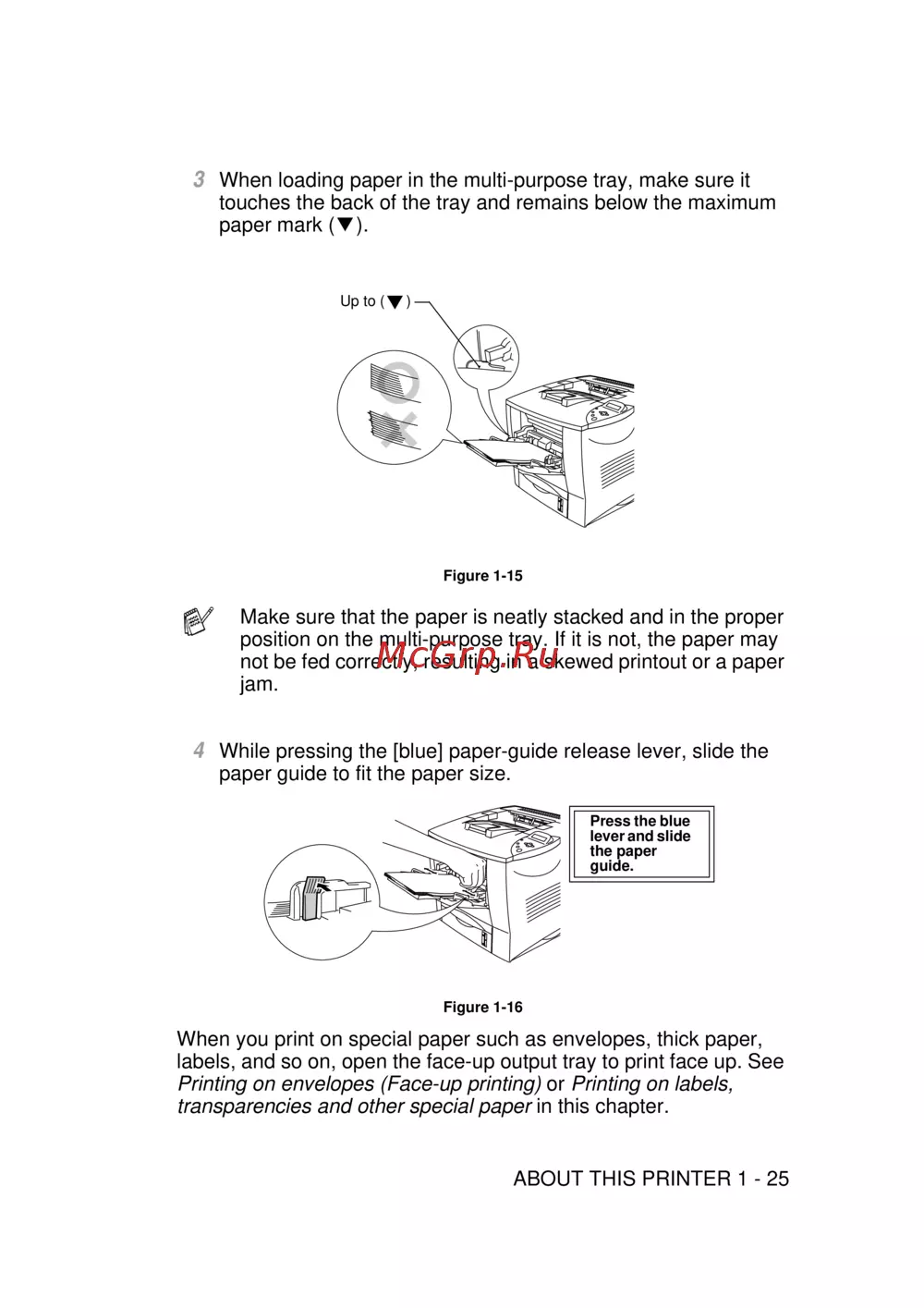 Brother HL-7050 — как правильно загружать бумагу в многофункциональный лоток принтера [44/253]
