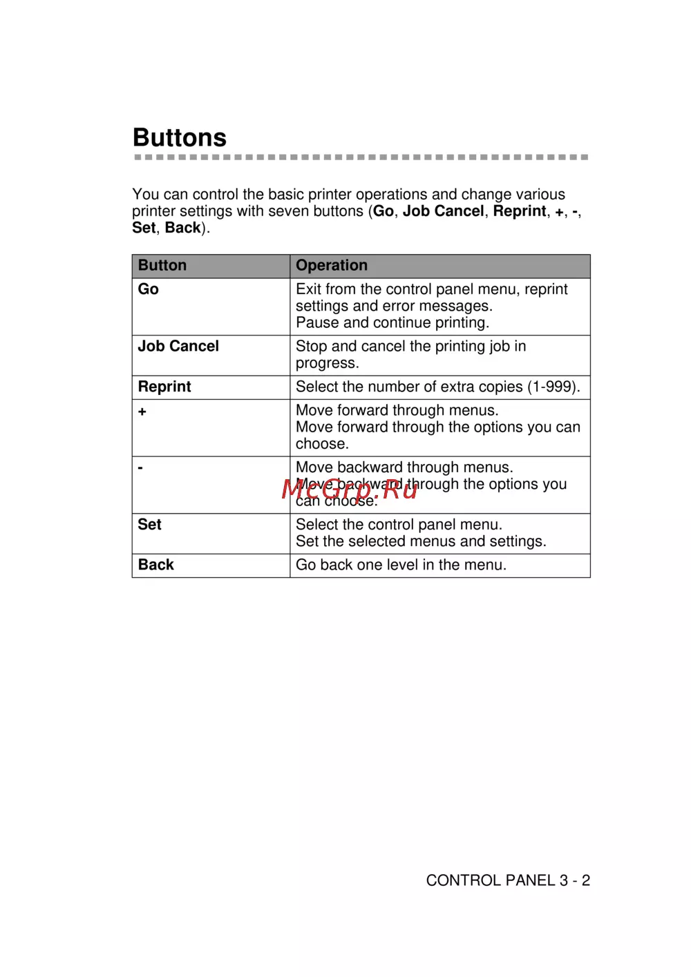 printer settings with seven buttons (Go, Job Cancel, Reprint, +, -,