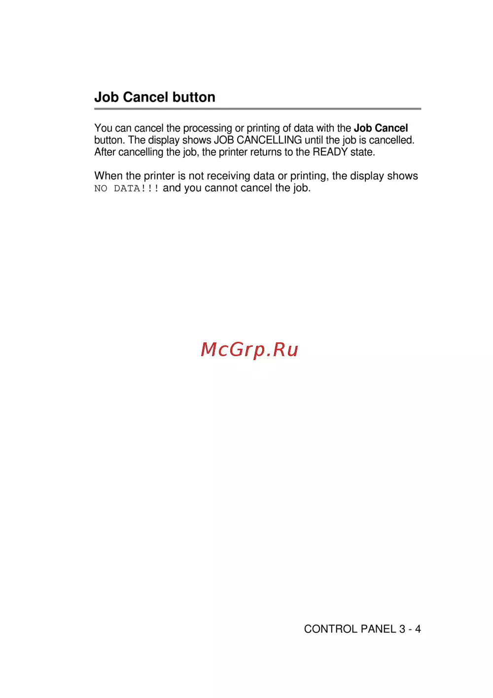 button. The display shows JOB CANCELLING until the job is cancelled.