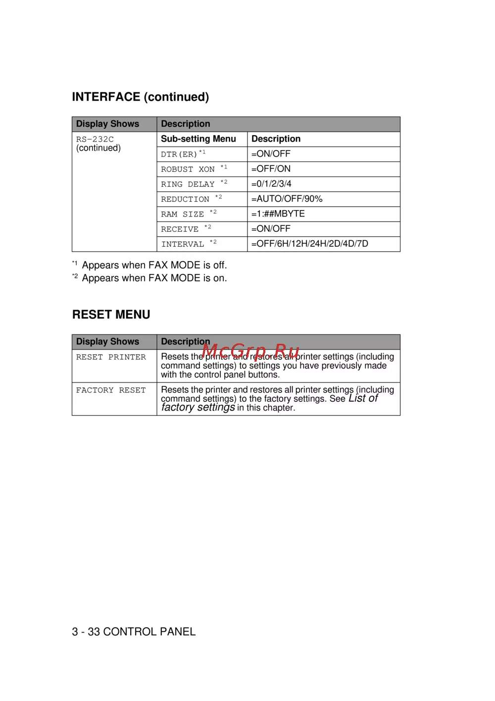 FACTORY RESET Resets the printer and restores all printer settings (including