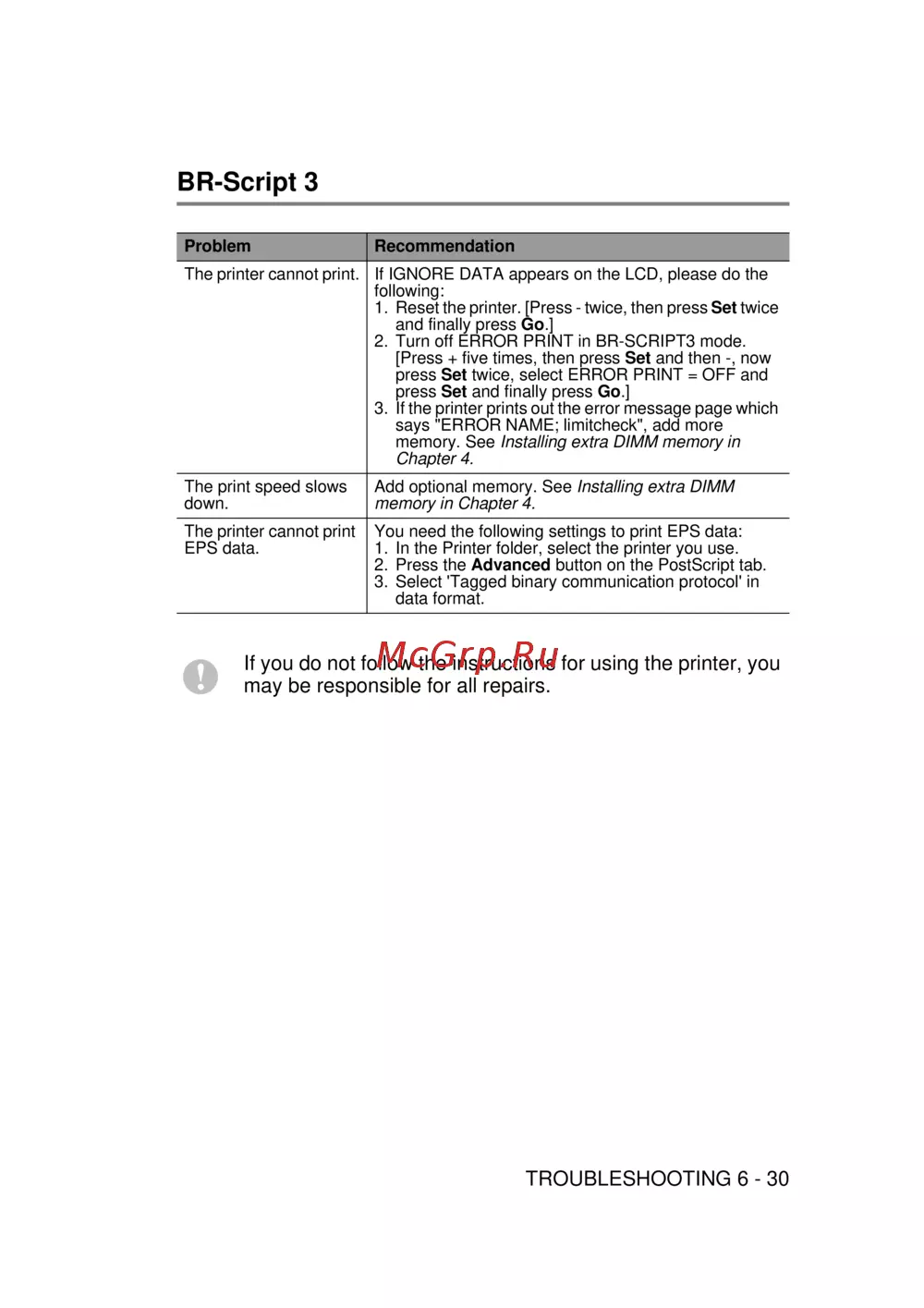 - If you do not follow the instructions for using the printer you may be responsible for all repairs p.198