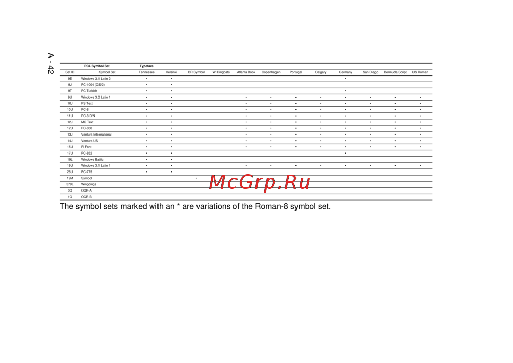 - The symbol sets marked with an are variations of the roman 8 symbol set lettergothic 16 6 ocr a and ocr b are bitmapped fonts p.239