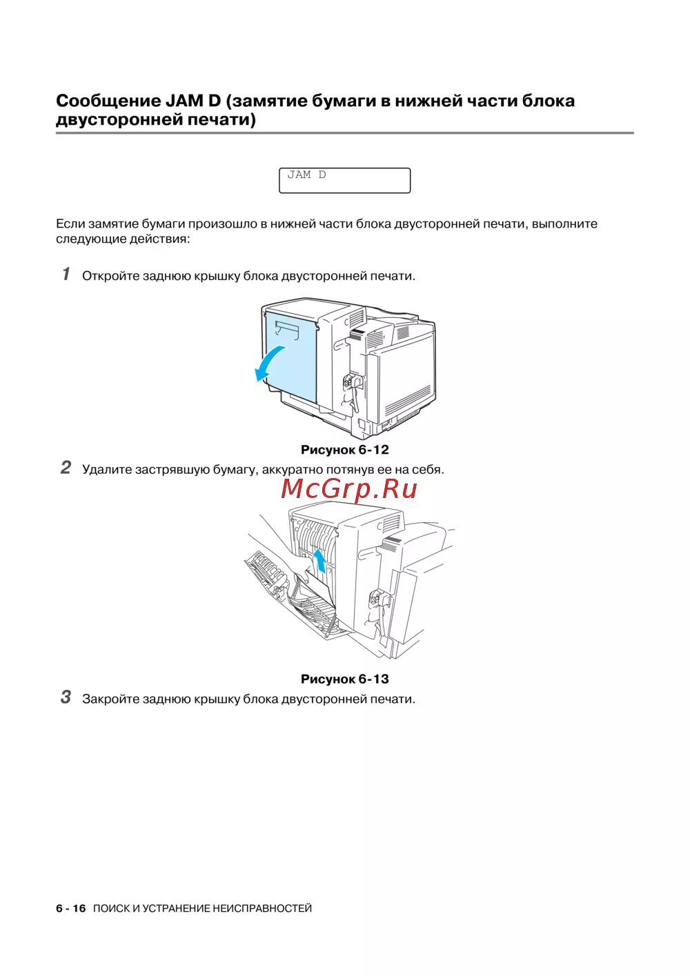 - Сообщение jam d замятие бумаги в нижней части блока двусторонней печати p.158