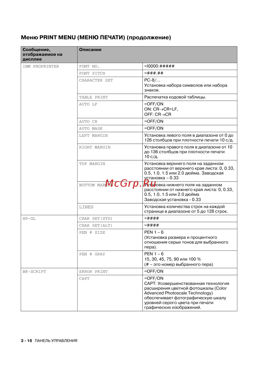 Меню PRINT MENU (МЕНЮ ПЕЧАТИ) (продолжение)