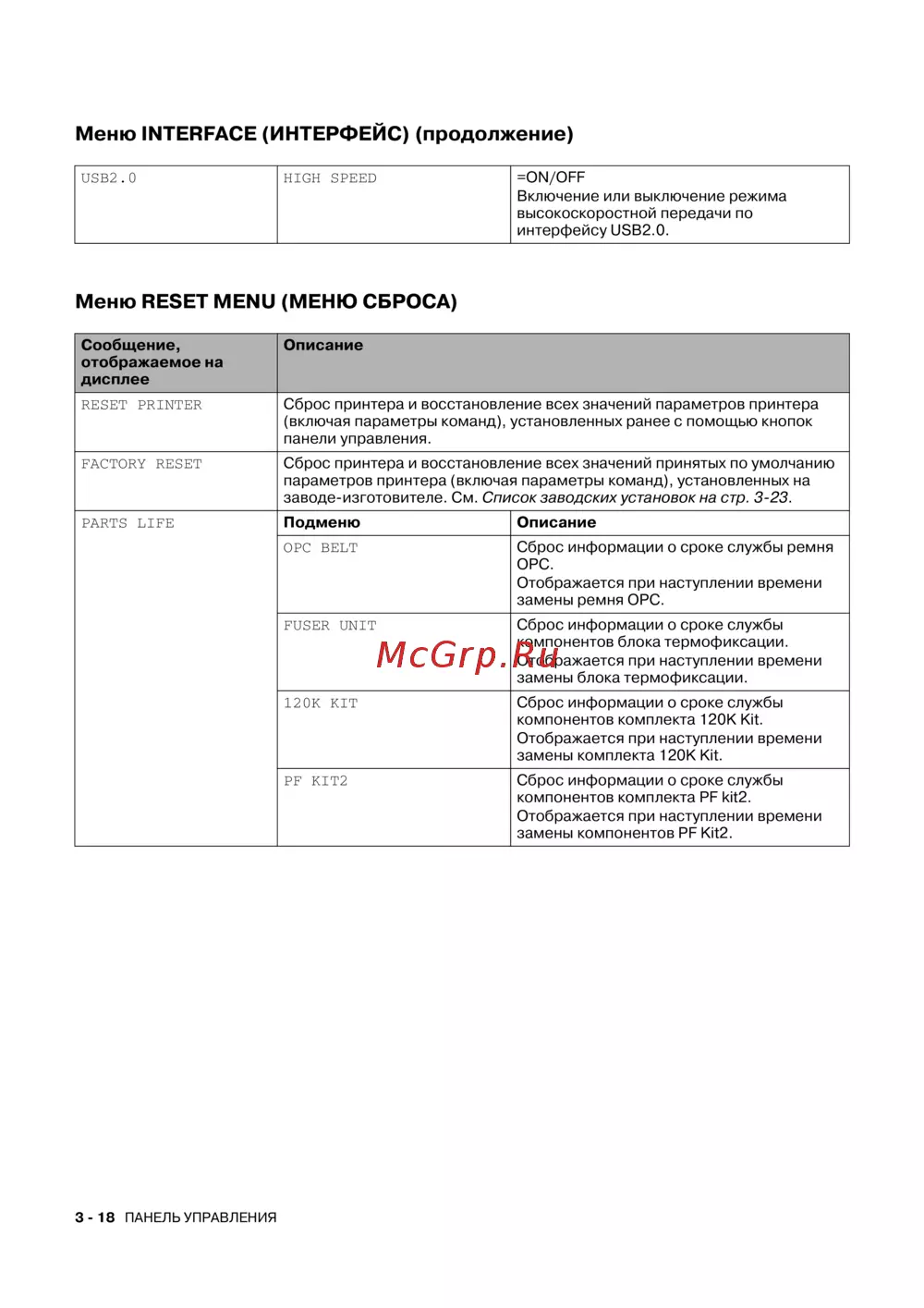 Изучите функции управления принтером, включая сброс параметров и настройки интерфейса USB. Узнайте, как восстановить заводские настройки и следить за сроком службы компонентов.