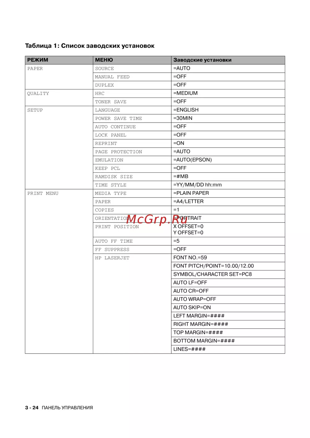 РЕЖИМ МЕНЮ Заводские установки