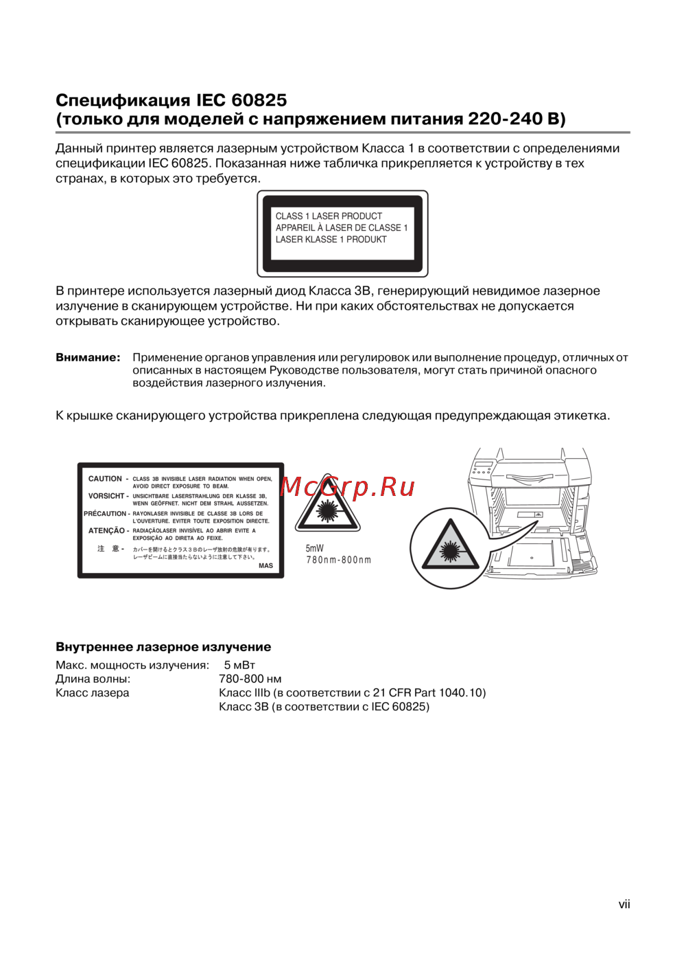 - В принтере используется лазерный диод класса 3b генерирующий невидимое лазерное излучение в сканирующем устройстве ни при каких обстоятельствах не допускается открывать сканирующее устройство p.9