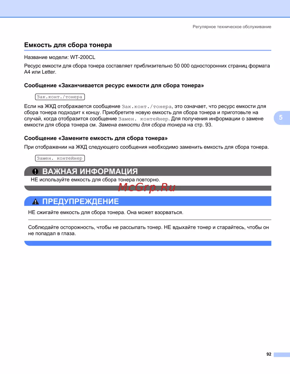 Узнайте о регулярном техническом обслуживании и замене емкости для сбора тонера. Важные советы по безопасности и рекомендации по замене.