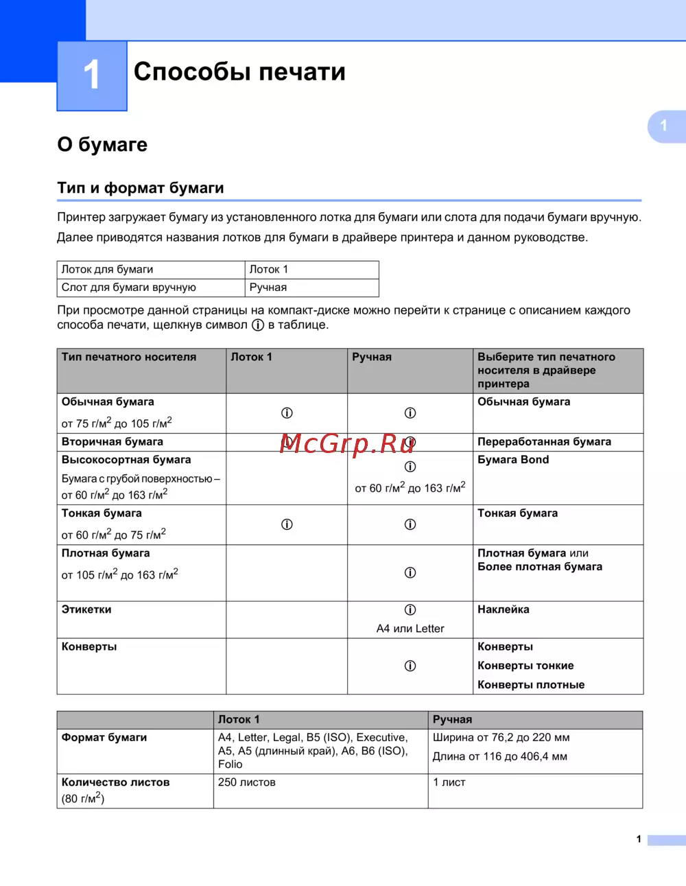 Тип печатного носителя Лоток 1 Ручная Выберите тип печатного