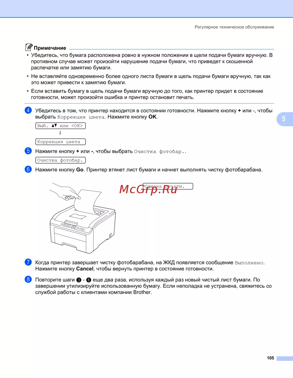 Узнайте, как правильно выполнять техническое обслуживание принтера, включая загрузку бумаги и очистку фотобарабана. Следуйте простым шагам для предотвращения замятий.