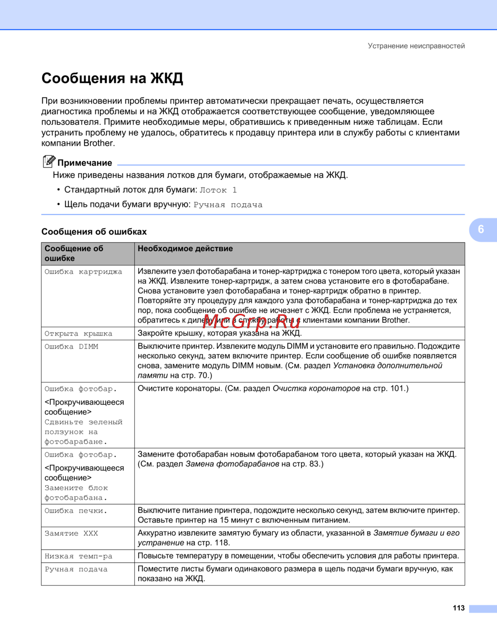- При возникновении проблемы принтер автоматически прекращает печать осуществляется диагностика проблемы и на жкд отображается соответствующее сообщение уведомляющее пользователя примите необходимые меры обратившись к приведенным ниже таблицам если устранить проблему не удалось обратитесь к продавцу принтера или в службу работы с клиентами компании brother p.123