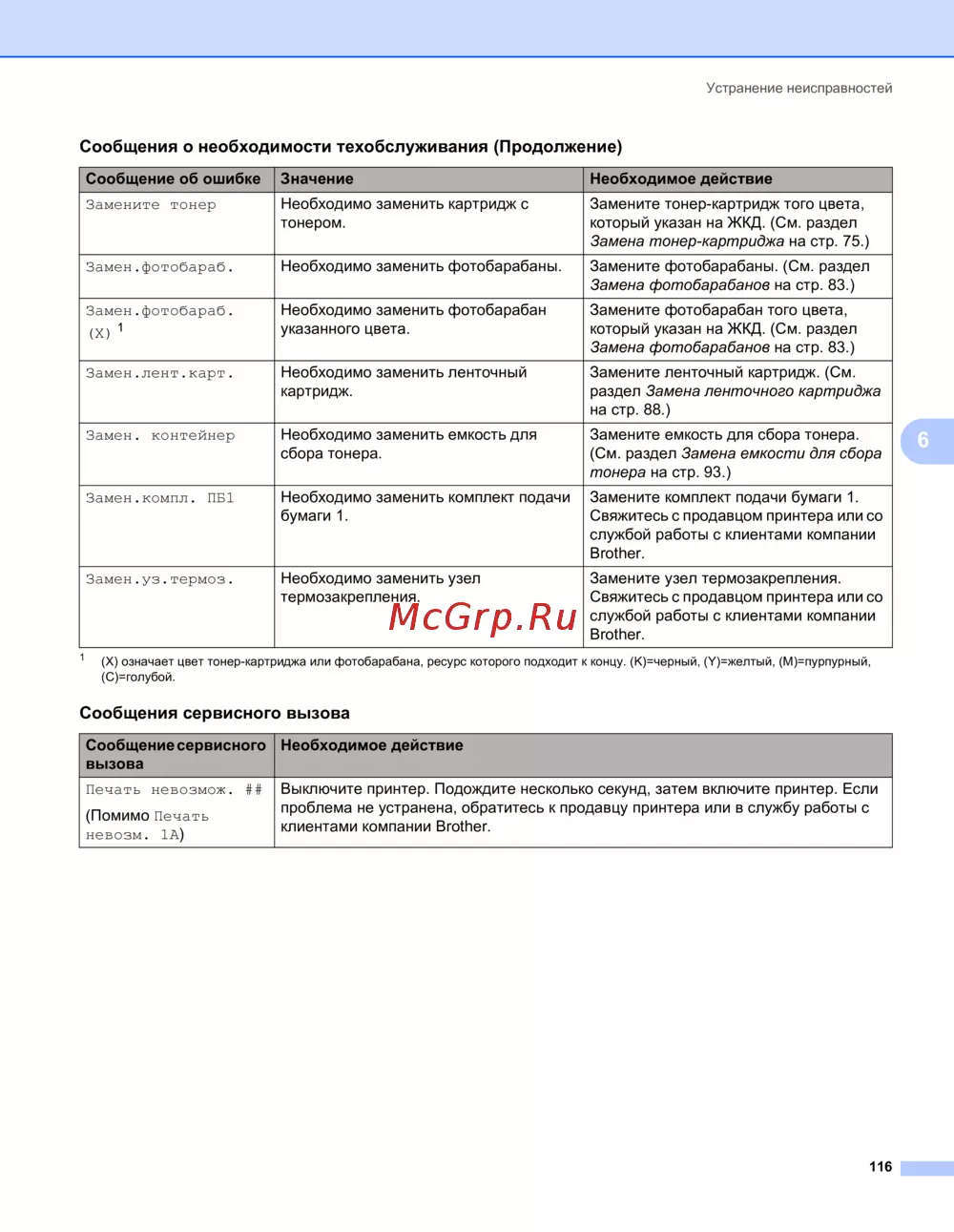 - При возникновении проблемы принтер автоматически прекращает печать осуществляется диагностика проблемы и на жкд отображается соответствующее сообщение уведомляющее пользователя примите необходимые меры обратившись к приведенным ниже таблицам если устранить проблему не удалось обратитесь к продавцу принтера или в службу работы с клиентами компании brother p.123