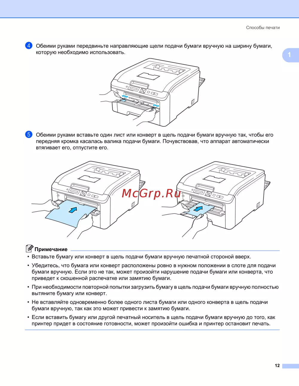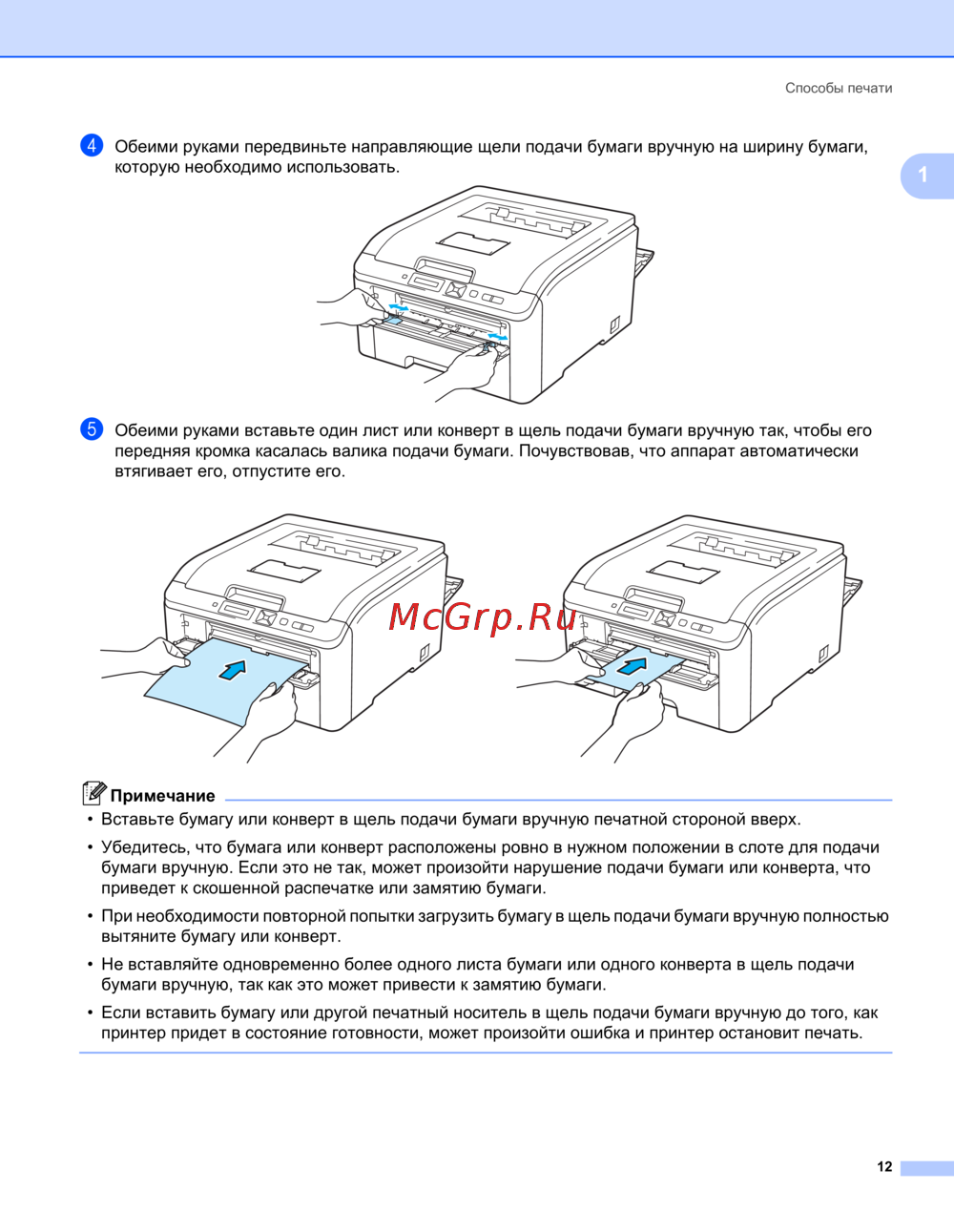 бумаги вручную. Если это не так, может произойти нарушение подачи бумаги или конверта, что