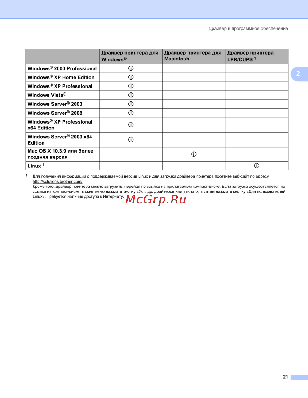 Для получения информации о поддерживаемой версии Linux и для загрузки драйвера принтера посетите веб-сайт по адресу