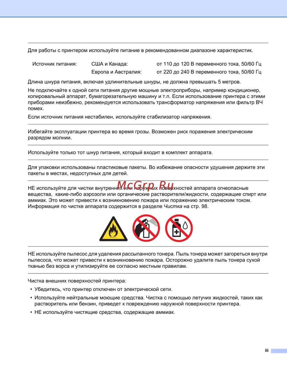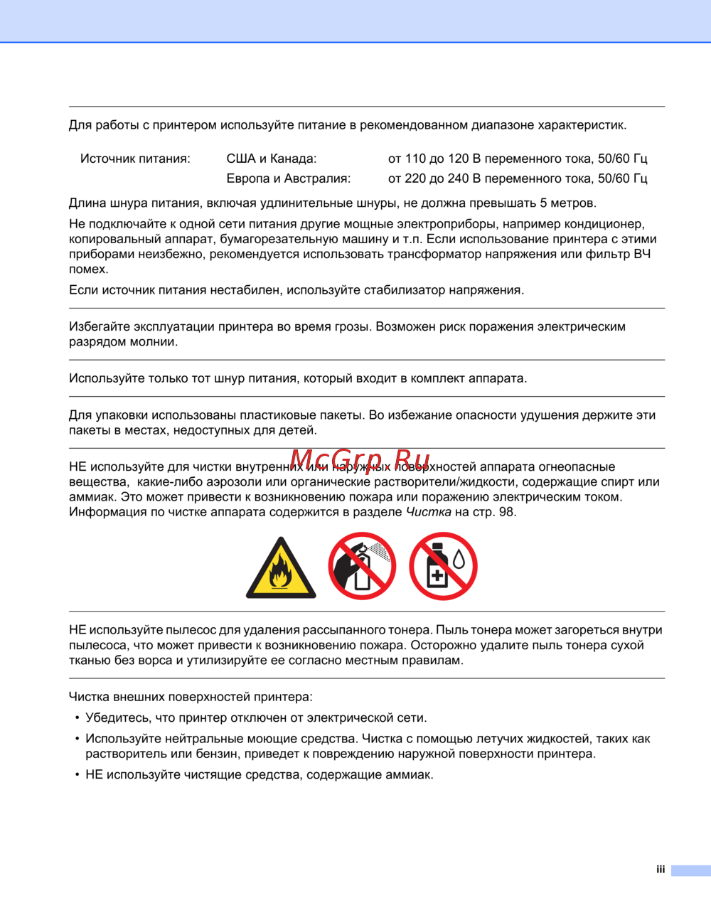 Brother HL-3040CN — рекомендации по безопасной эксплуатации принтера и его чистке [4/155]