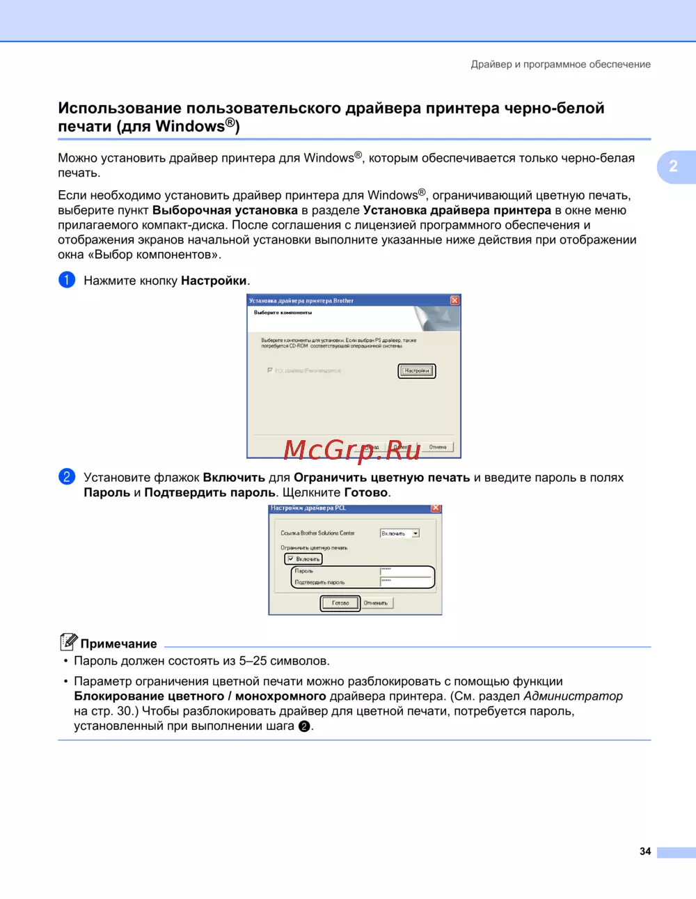 на стр. 30.) Чтобы разблокировать драйвер для цветной печати, потребуется пароль,
