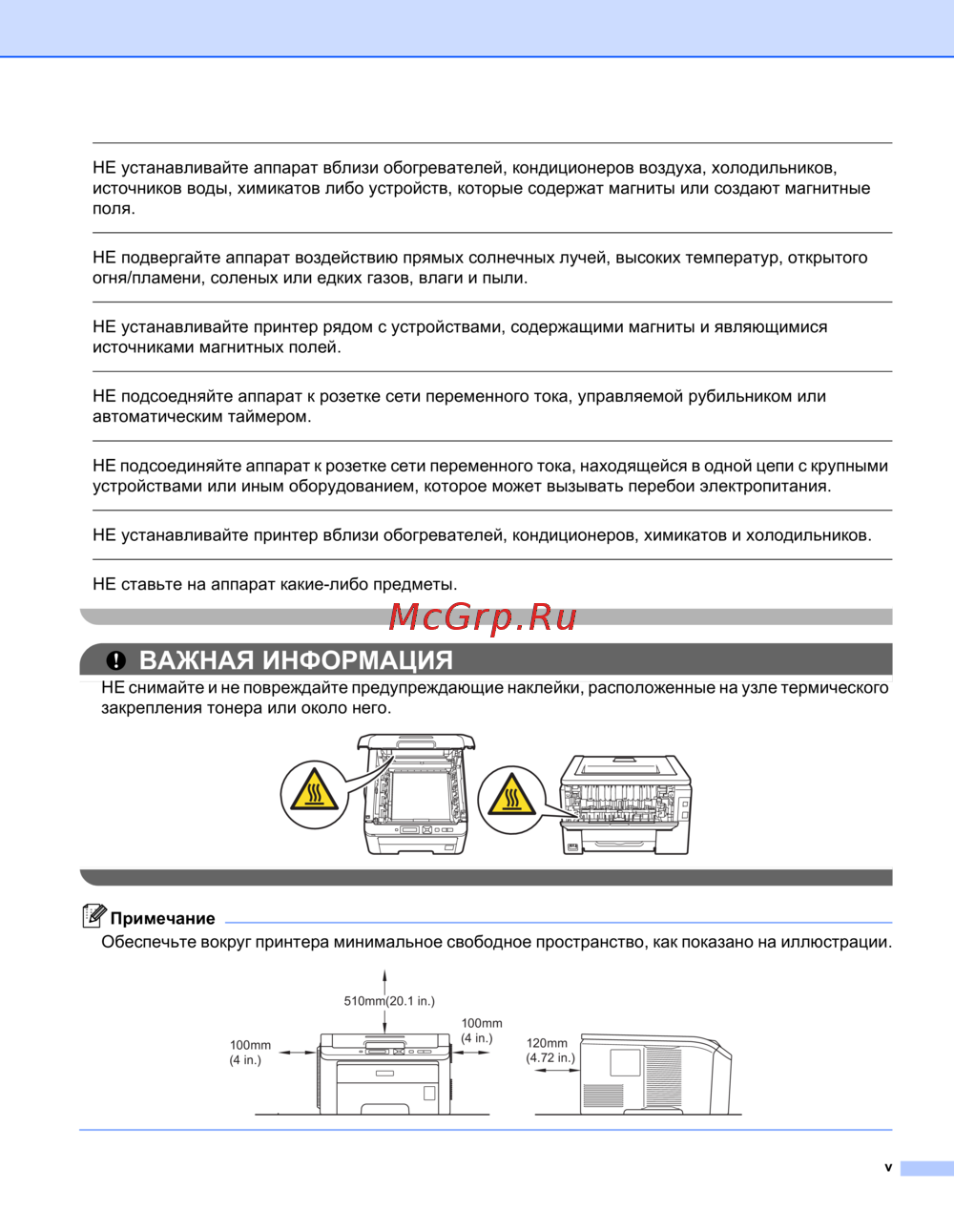 - Не устанавливайте принтер таким образом чтобы его вентиляционное отверстие было заблокировано оставьте около 100 мм свободного пространства между вентиляционным отверстием и стеной p.5