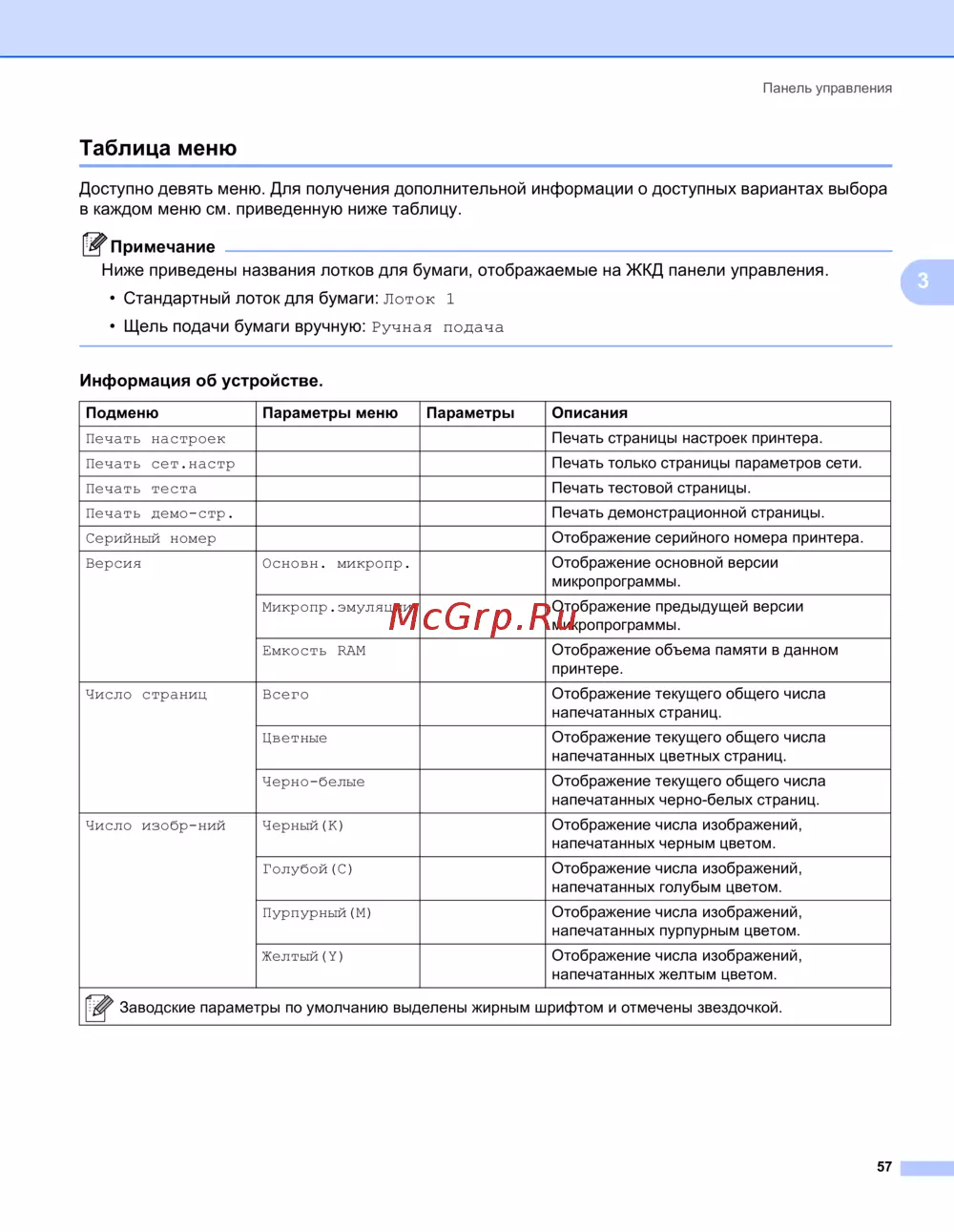 Узнайте о доступных меню и параметрах управления принтером. Получите информацию о печати настроек, серийном номере и количестве напечатанных страниц.