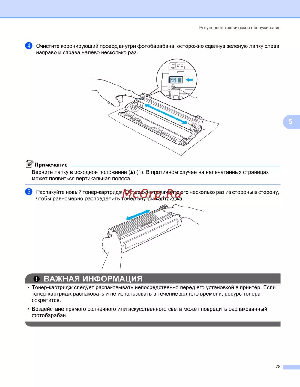 Узнайте, как правильно проводить техническое обслуживание принтера, включая очистку фотобарабана и подготовку тонер-картриджа для качественной печати.