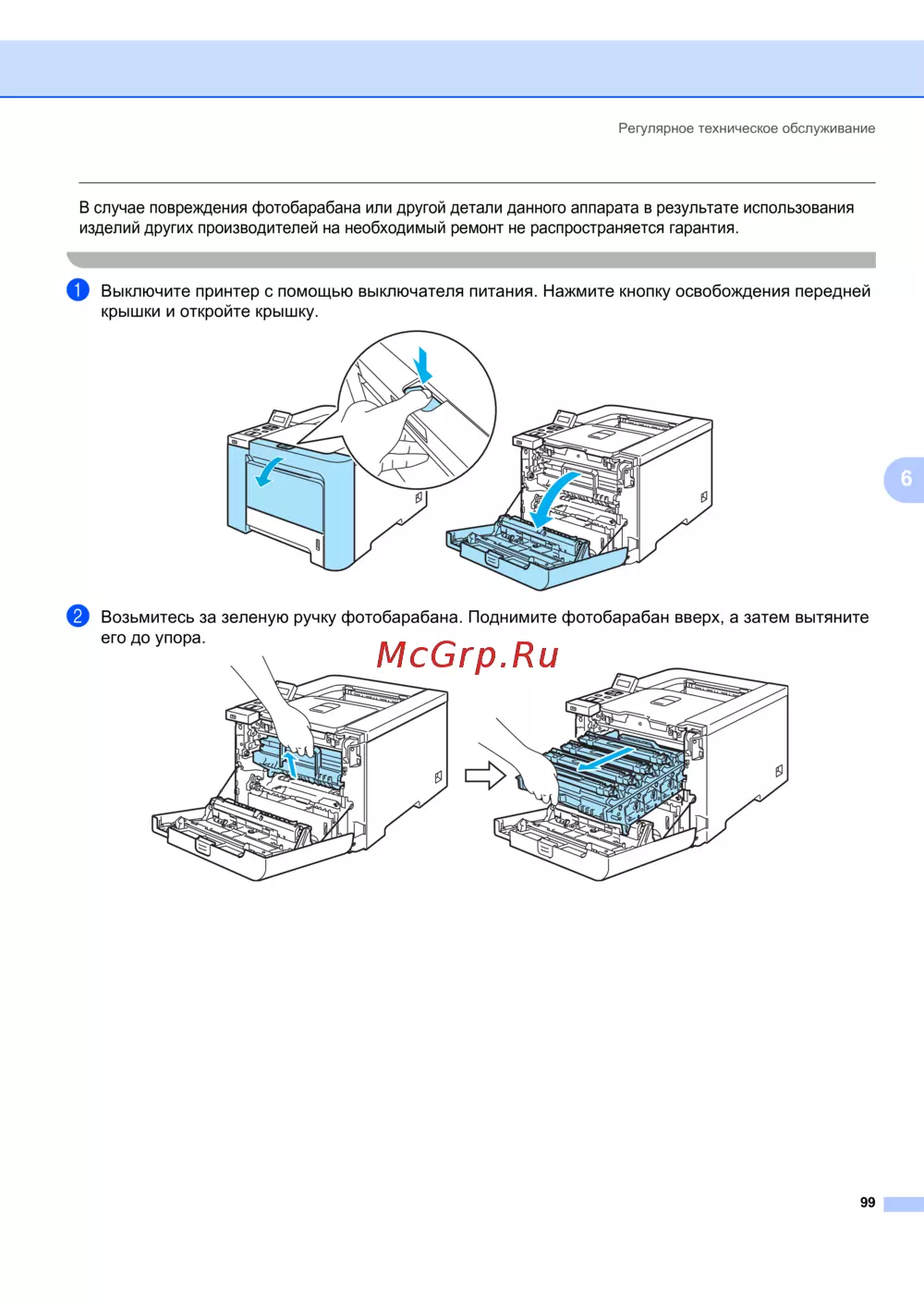 В случае повреждения фотобарабана или другой детали данного аппарата в результате использования