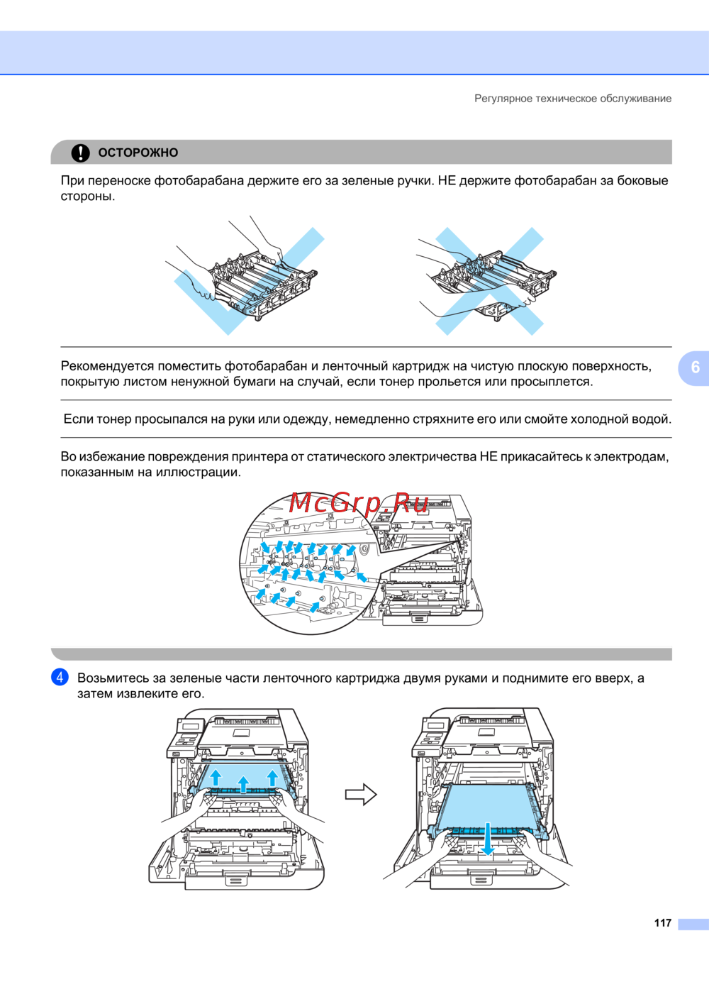 - При переноске фотобарабана держите его за зеленые ручки не держите фотобарабан за боковые стороны p.165