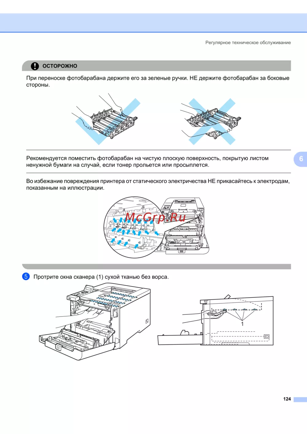 - При переноске фотобарабана держите его за зеленые ручки не держите фотобарабан за боковые стороны p.165