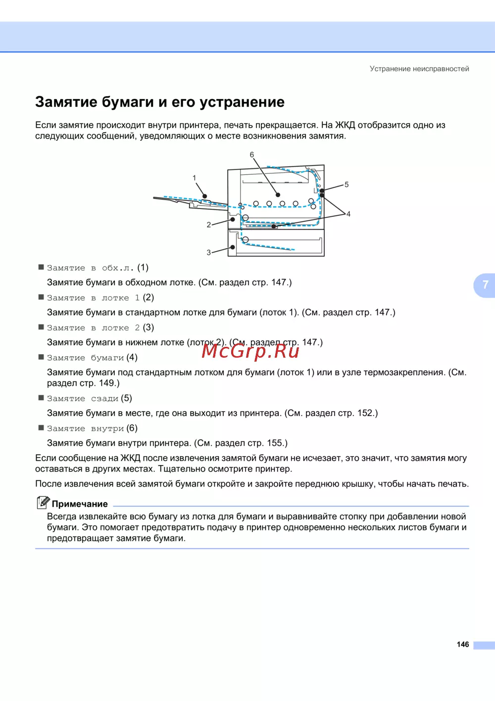 Замятие бумаги в стандартном лотке для бумаги (лоток 1). (См. раздел стр.147.)