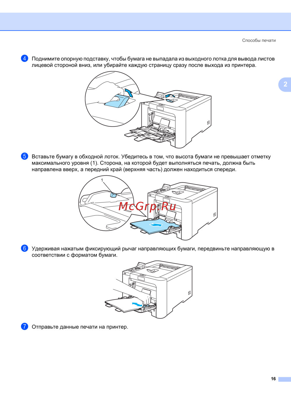 e Вставьте бумагу в обходной лоток. Убедитесь в том, что высота бумаги не превышает отметку