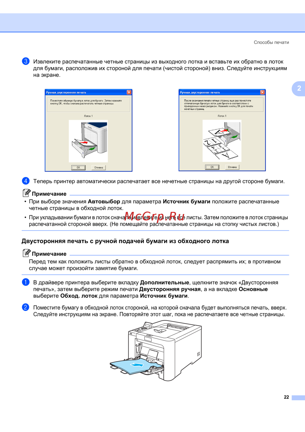 - Двусторонняя печать с ручной подачей бумаги из лотка для бумаги p.29