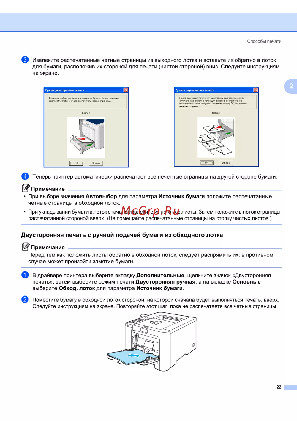 Двусторонняя печать с ручной подачей бумаги из обходного лотка 2