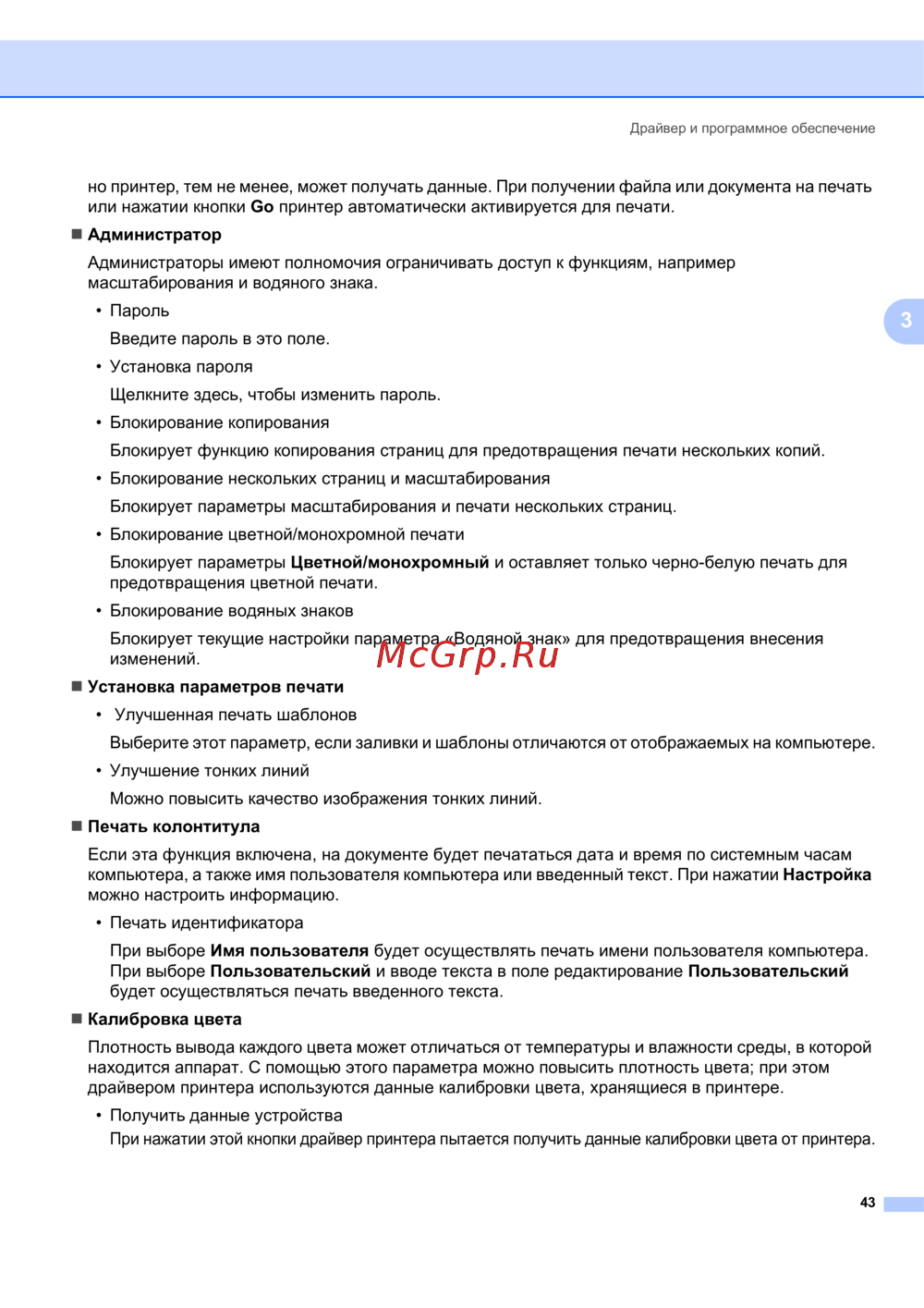 Узнайте о настройках и функциях управления печатью, включая блокировку копирования, установку пароля и калибровку цвета для оптимизации работы принтера.