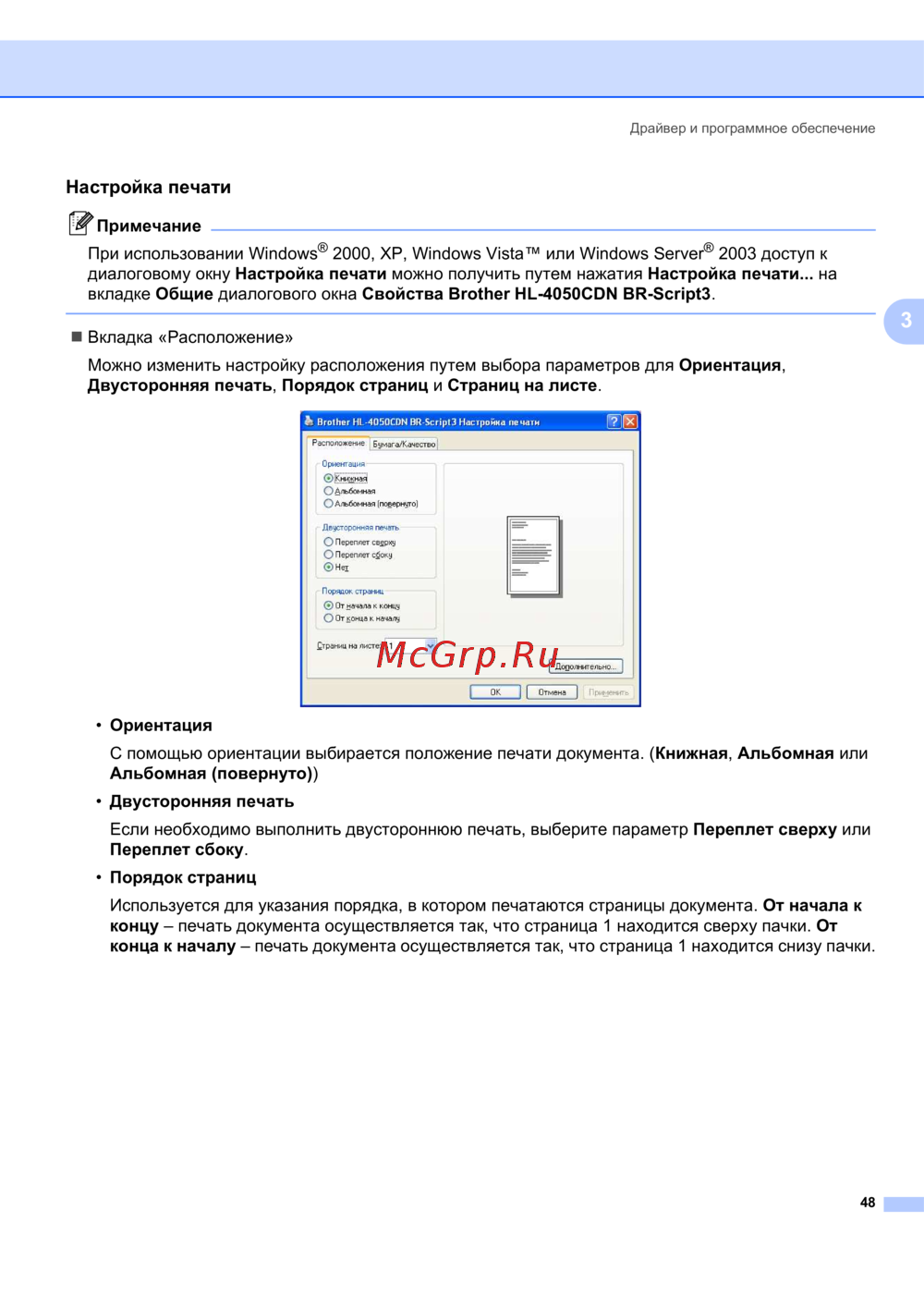 Brother HL-4040CN — настройка печати: Ориентация, Двусторонняя печать и Порядок страниц [56/202]