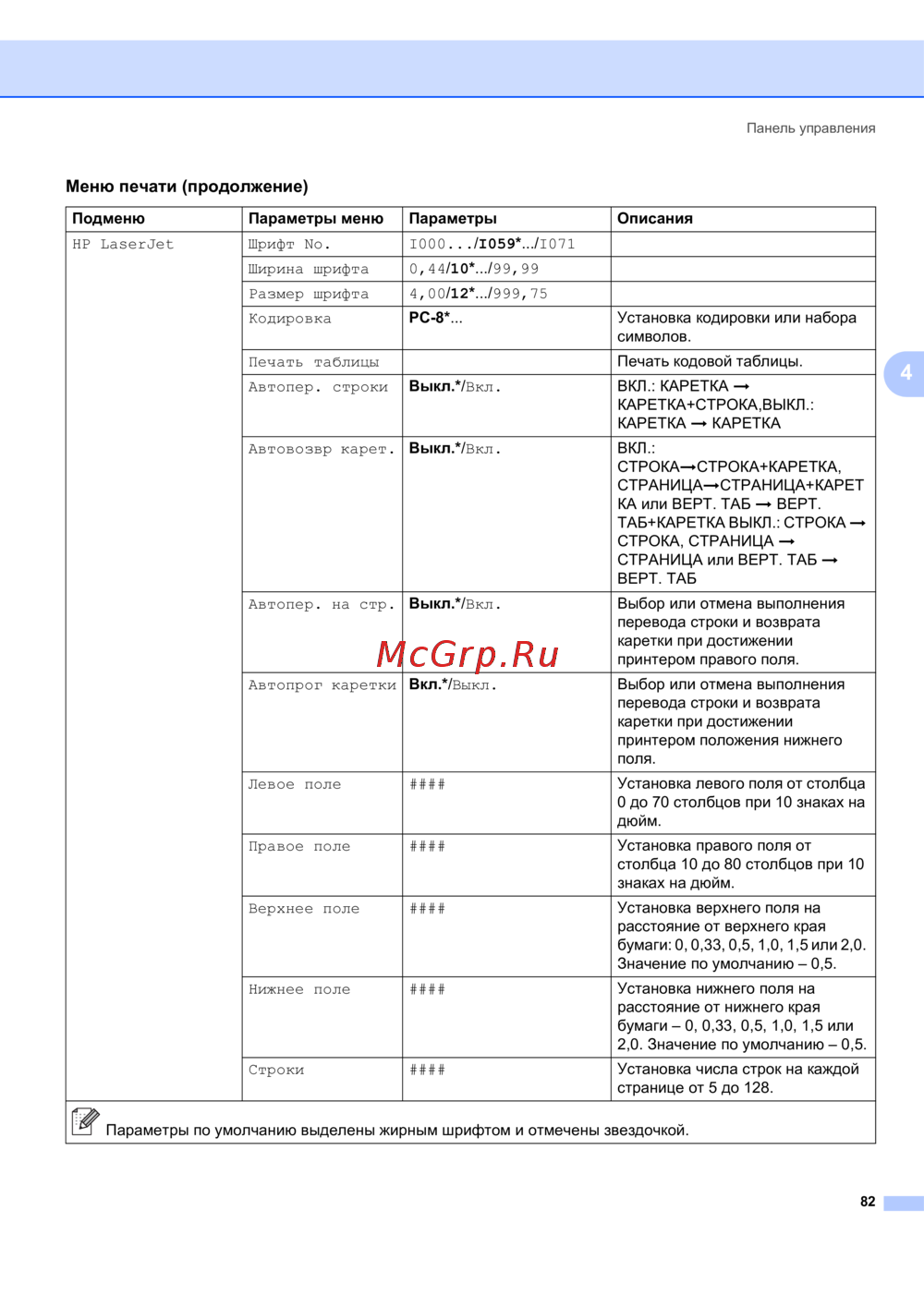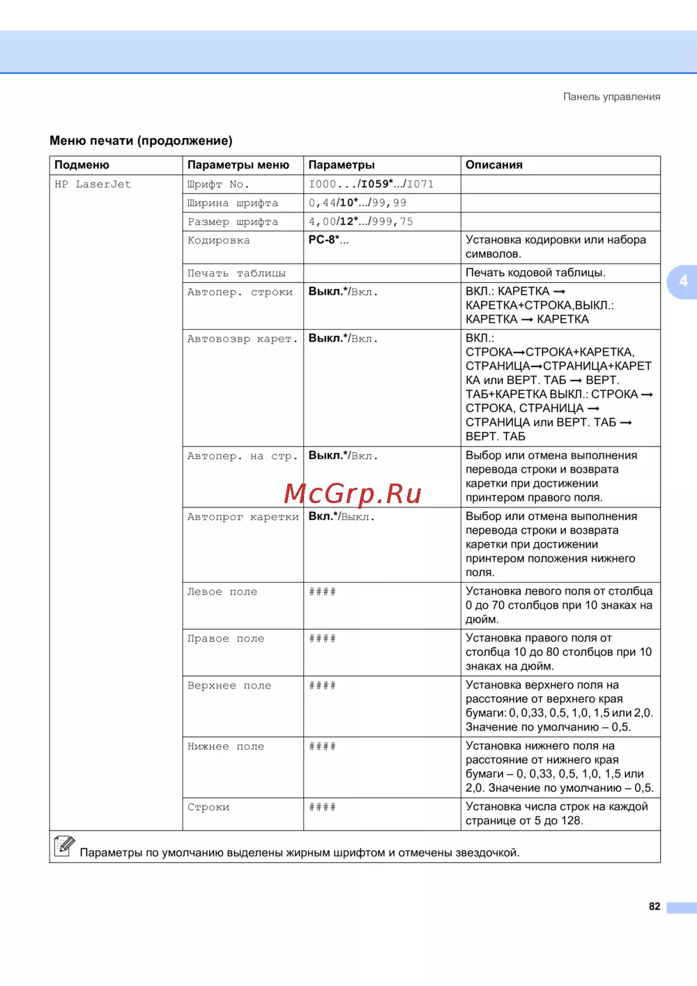 Параметры по умолчанию выделены жирным шрифтом и отмечены звездочкой.