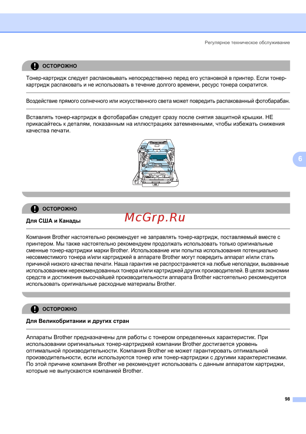 По этой причине компания Brother не рекомендует использовать с данным аппаратом картриджи,