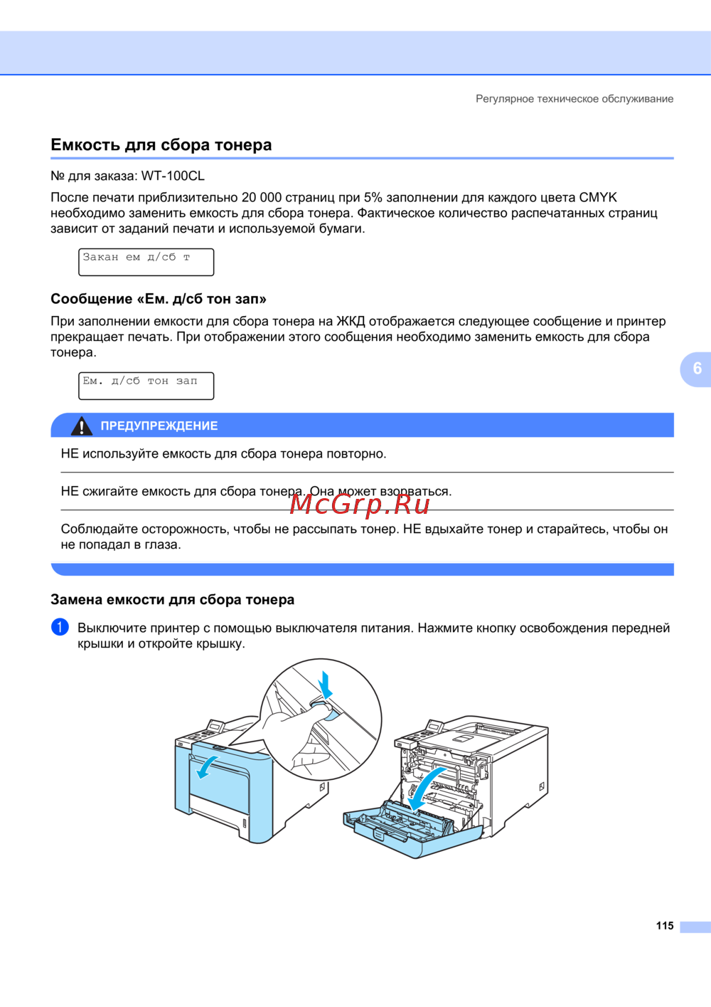 Узнайте, как правильно заменить емкость для сбора тонера после печати 20 000 страниц. Следуйте инструкциям для безопасного обслуживания вашего устройства.