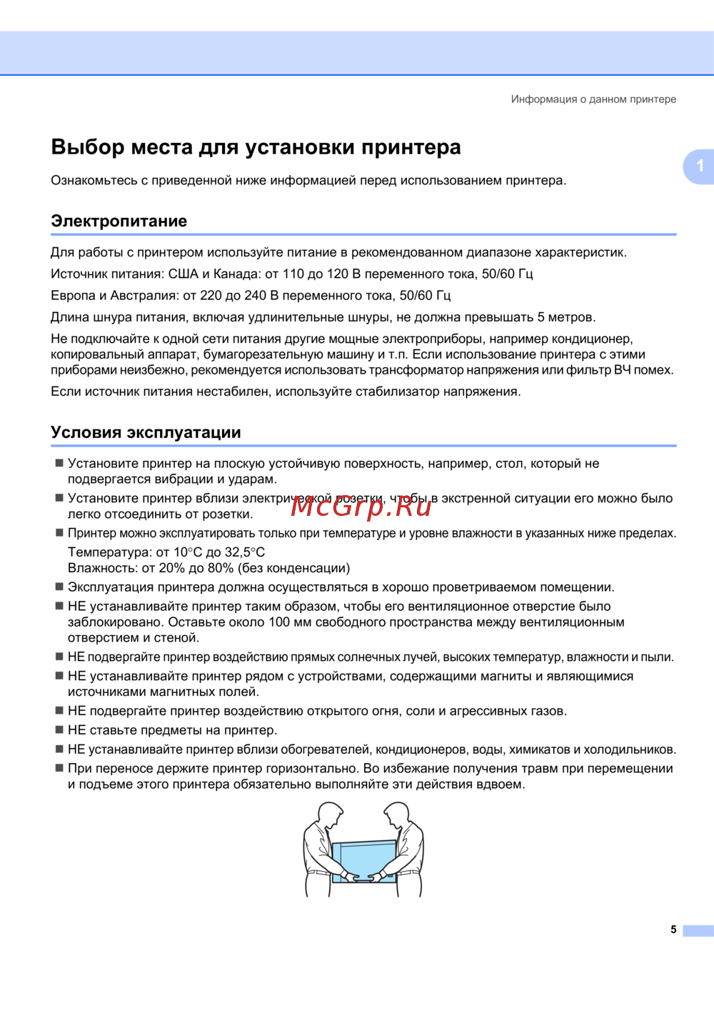 Узнайте, как правильно установить и эксплуатировать принтер для обеспечения его долговечности и надежной работы. Следуйте рекомендациям по электропитанию и условиям эксплуатации.