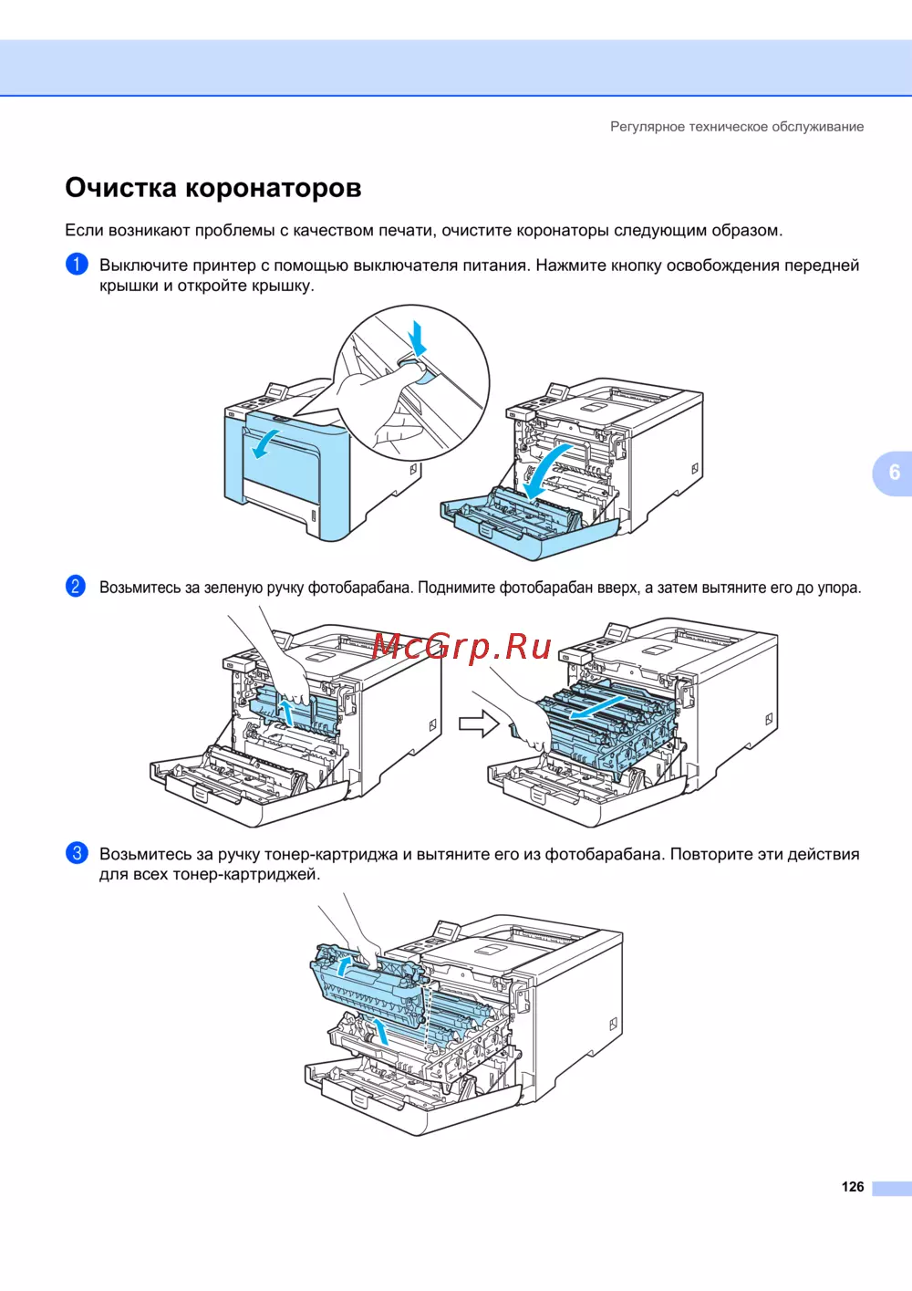 Если возникают проблемы с качеством печати, очистите коронаторы следующим образом.