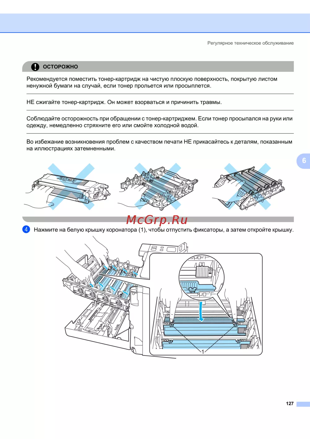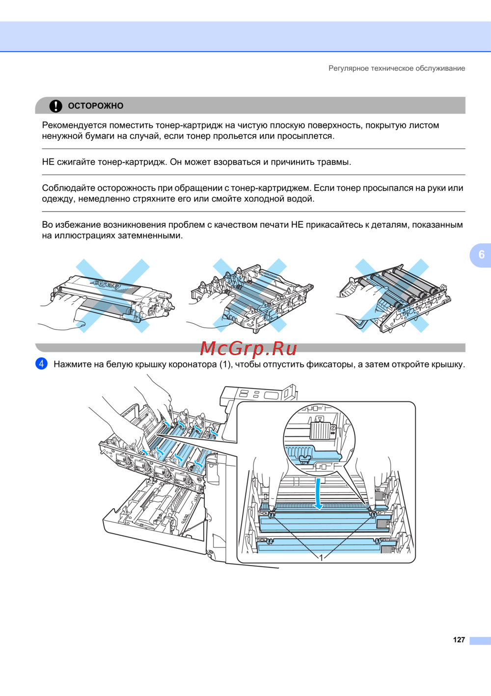 Соблюдайте осторожность при обращении с тонер-картриджем. Если тонер просыпался на руки или