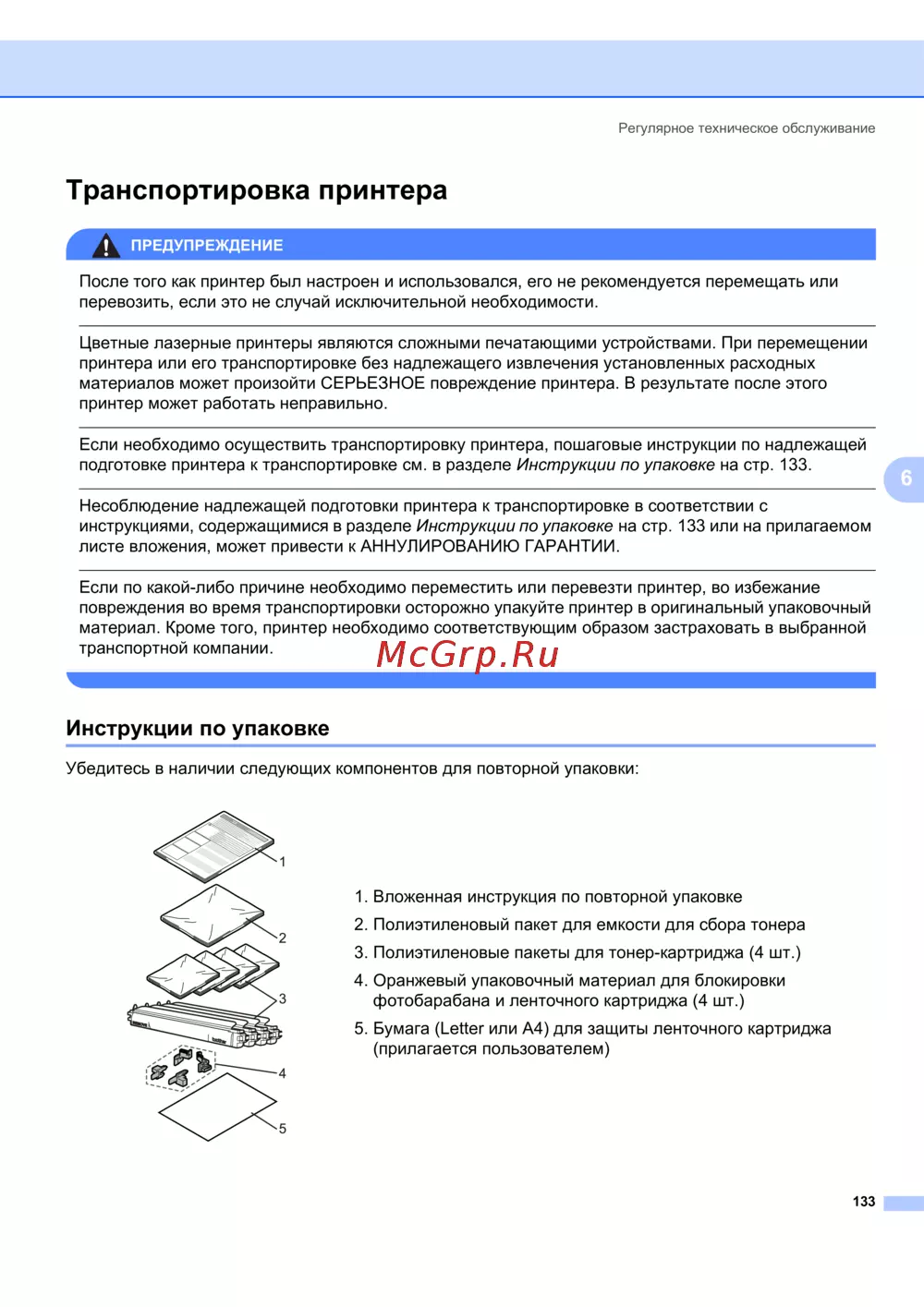 Узнайте, как правильно осуществлять техническое обслуживание и транспортировку лазерных принтеров, чтобы избежать повреждений и сохранить гарантию.