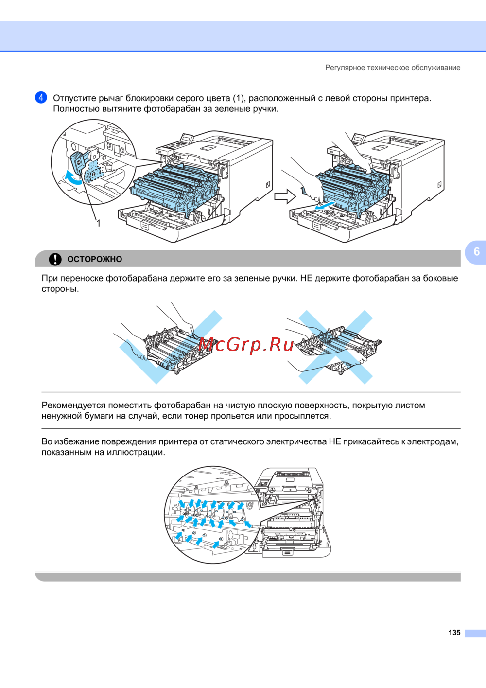 - При переноске фотобарабана держите его за зеленые ручки не держите фотобарабан за боковые стороны p.165